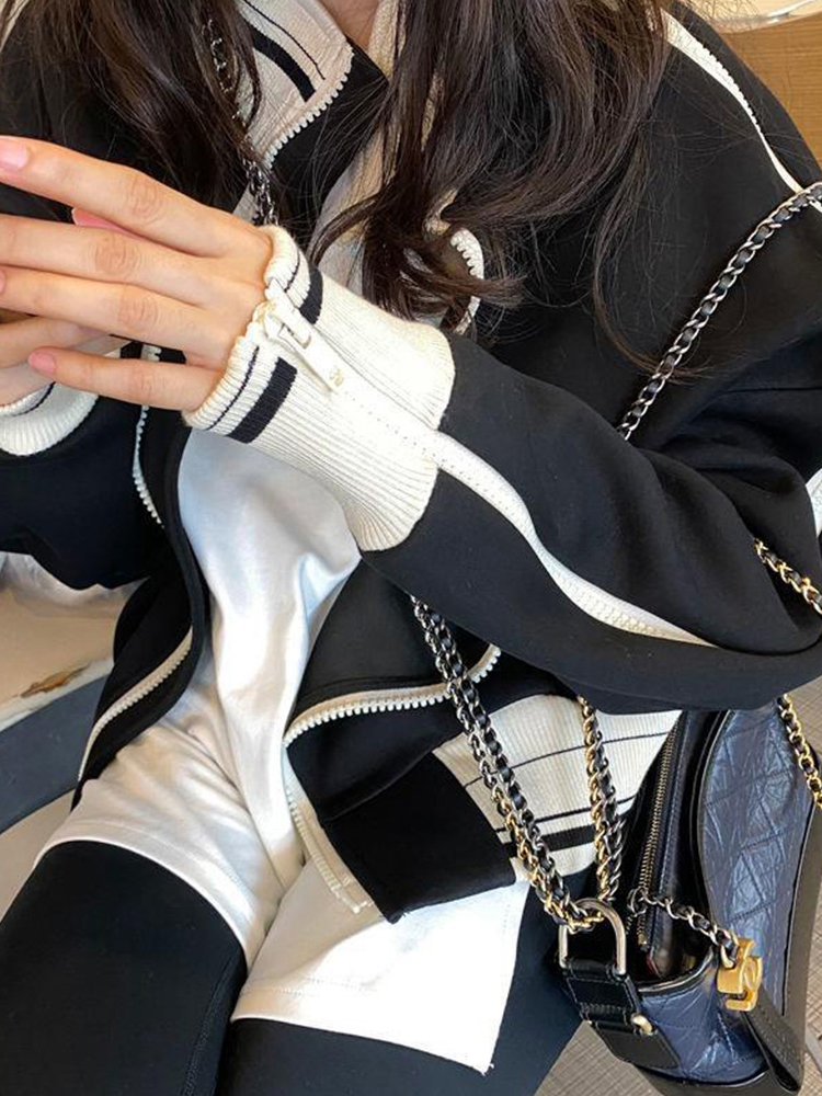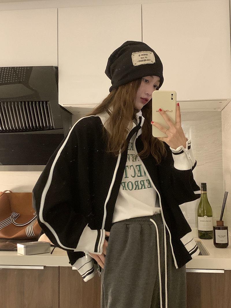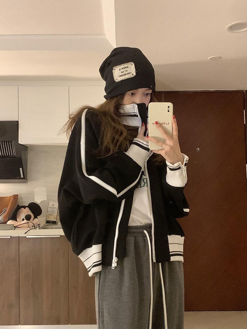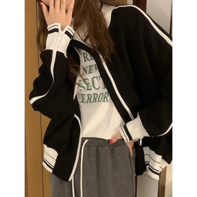 大码胖妹妹慵懒风立领棒球服外套女春秋冬宽松休闲拼接设计感上衣