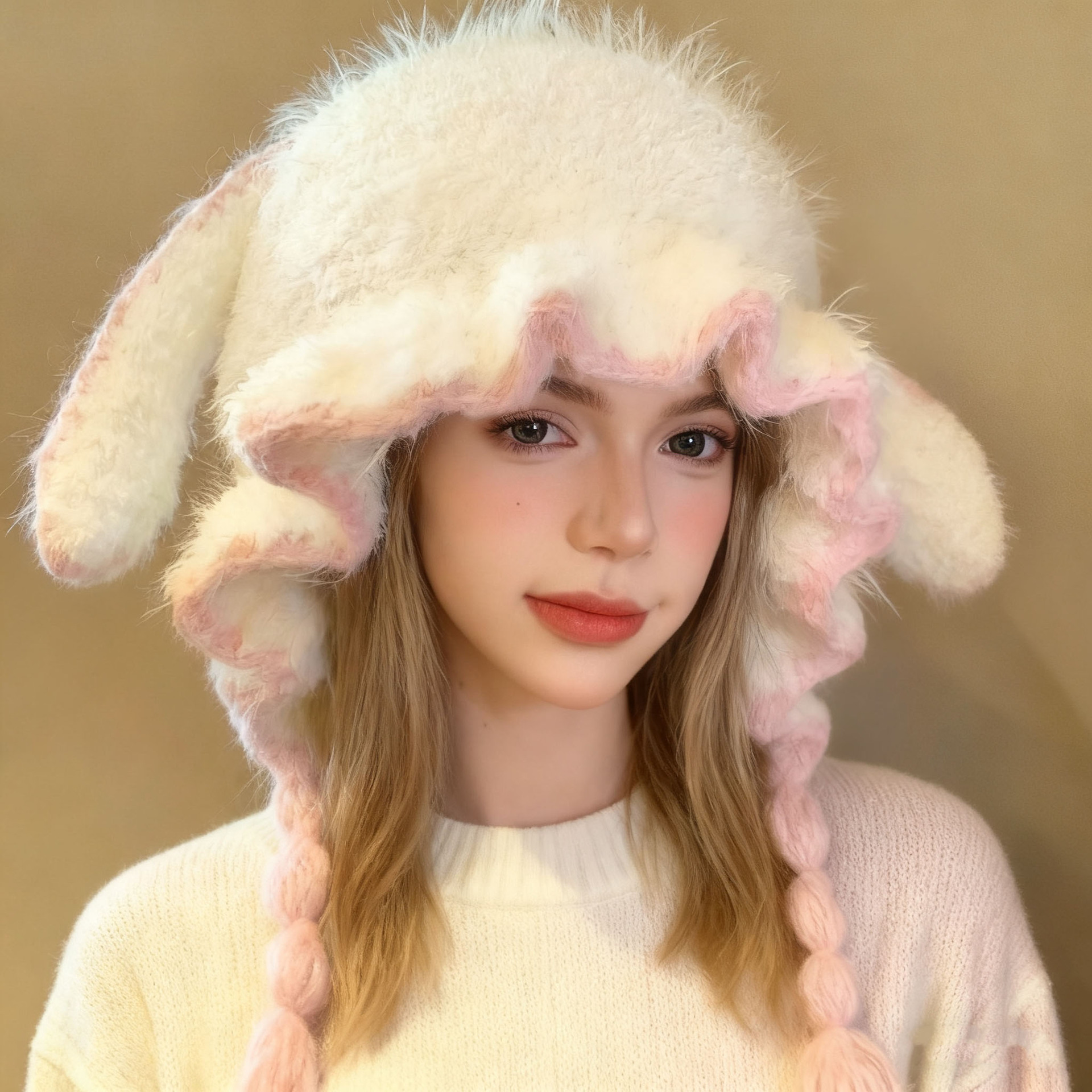可爱兔耳朵毛绒针织护耳帽女秋冬季保暖包头帽防寒显脸小套头帽子
