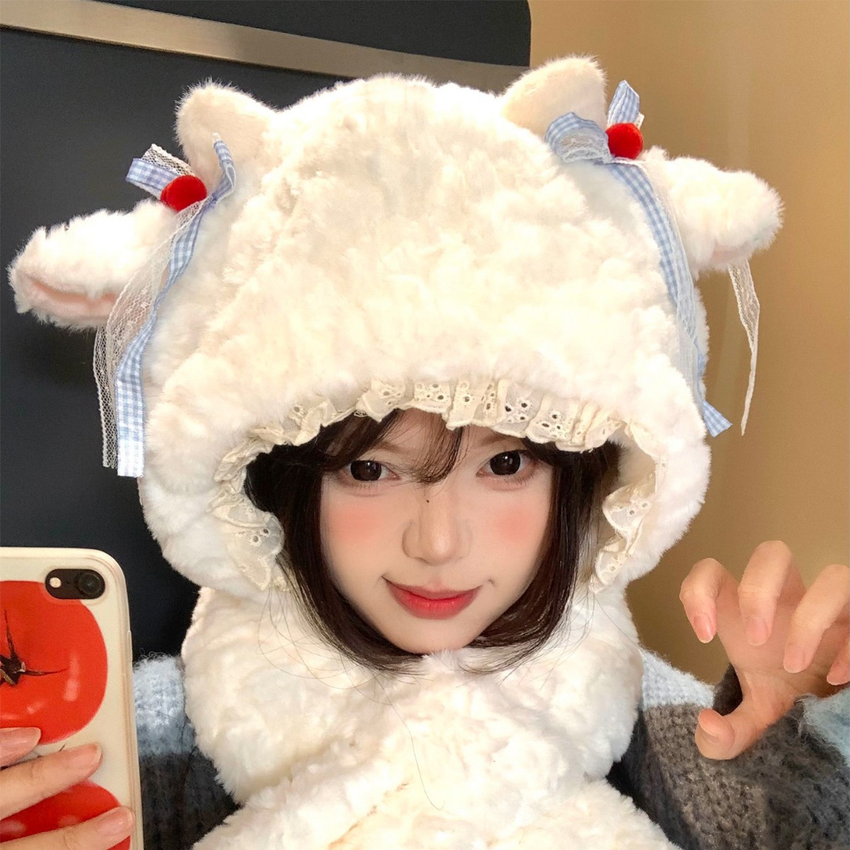 甜美可爱小羊毛绒帽子围巾一体女冬季加绒加厚保暖防寒护耳雷锋帽