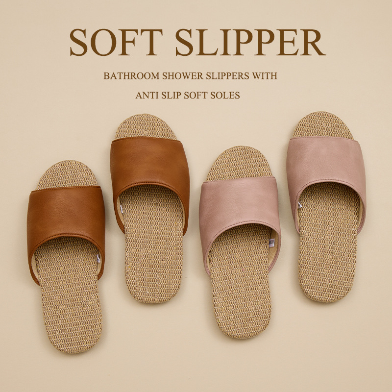 女性用の高級リネンスリッパ、夏の屋内および家庭用PUレザー滑り止めオフィス、男性用のオールシーズンウェアラブル牛腱底