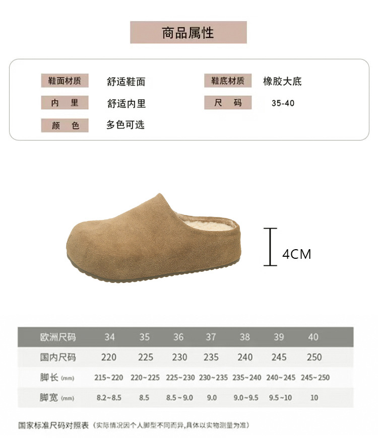 头层牛皮厚底增高4CM小个子勃肯包头半拖鞋女加绒外穿一脚蹬棉拖
