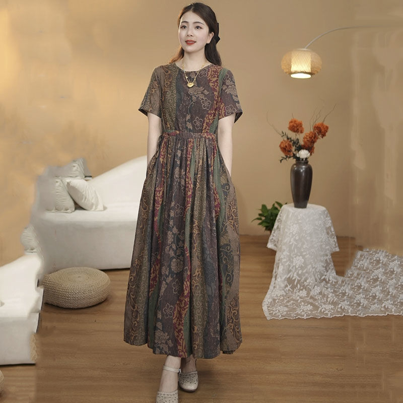 コットンとリネンのプリントラウンドネック半袖ドレス夏の新しいルーズカバーAラインスカートレトロ文学プリントロングスカート