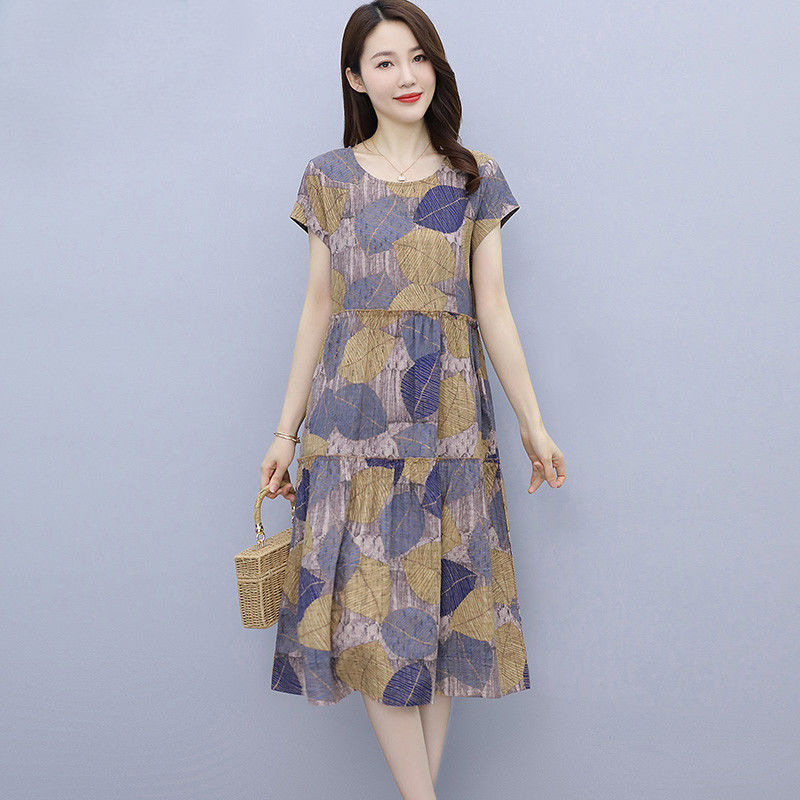 コットンとリネンのドレスプリント半袖ラウンドネック大きなスカートロングスカート夏の新しいルーズ大きいサイズカジュアルファッションロングスカート