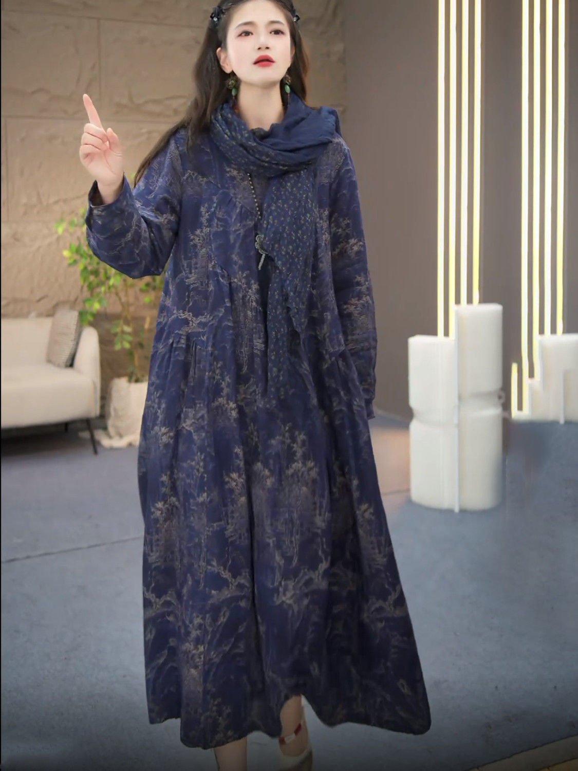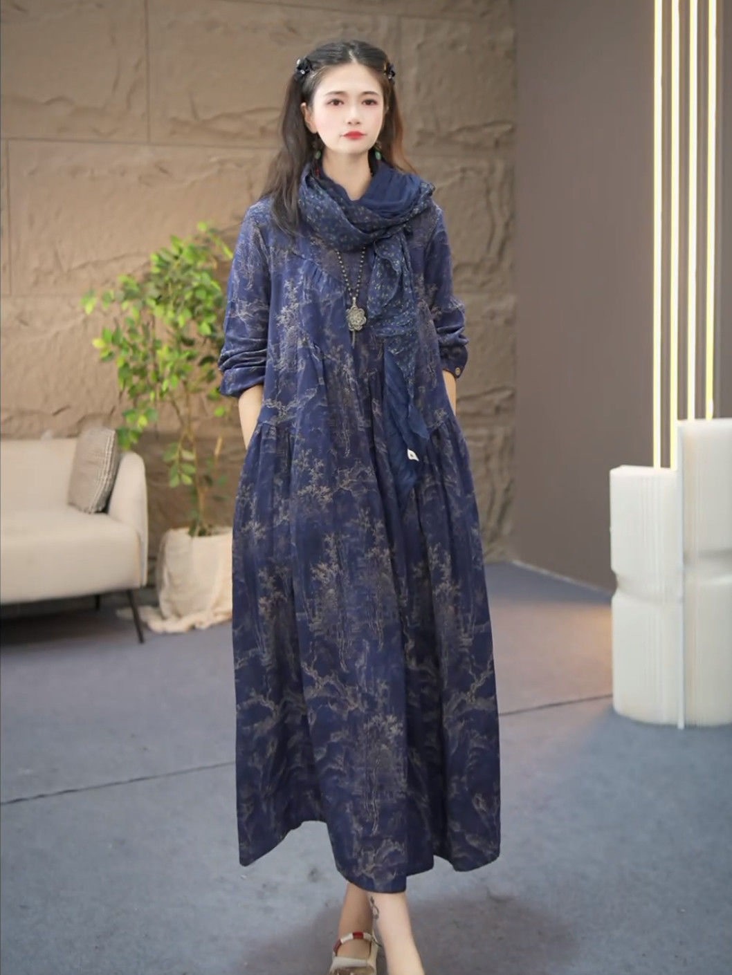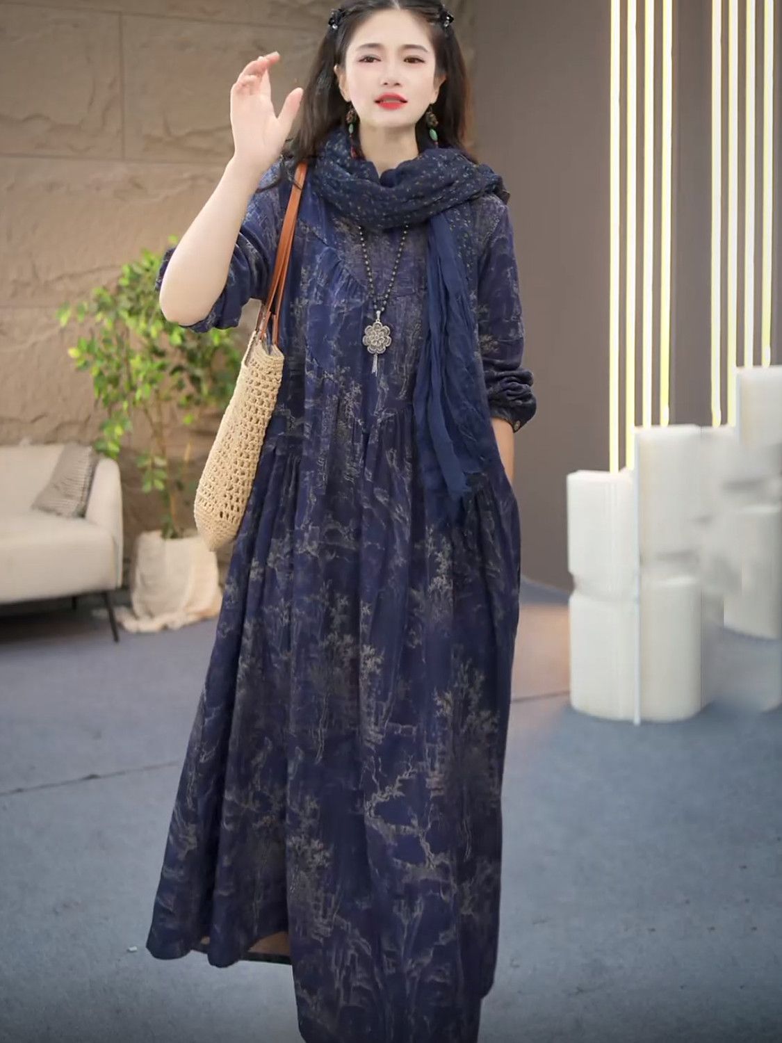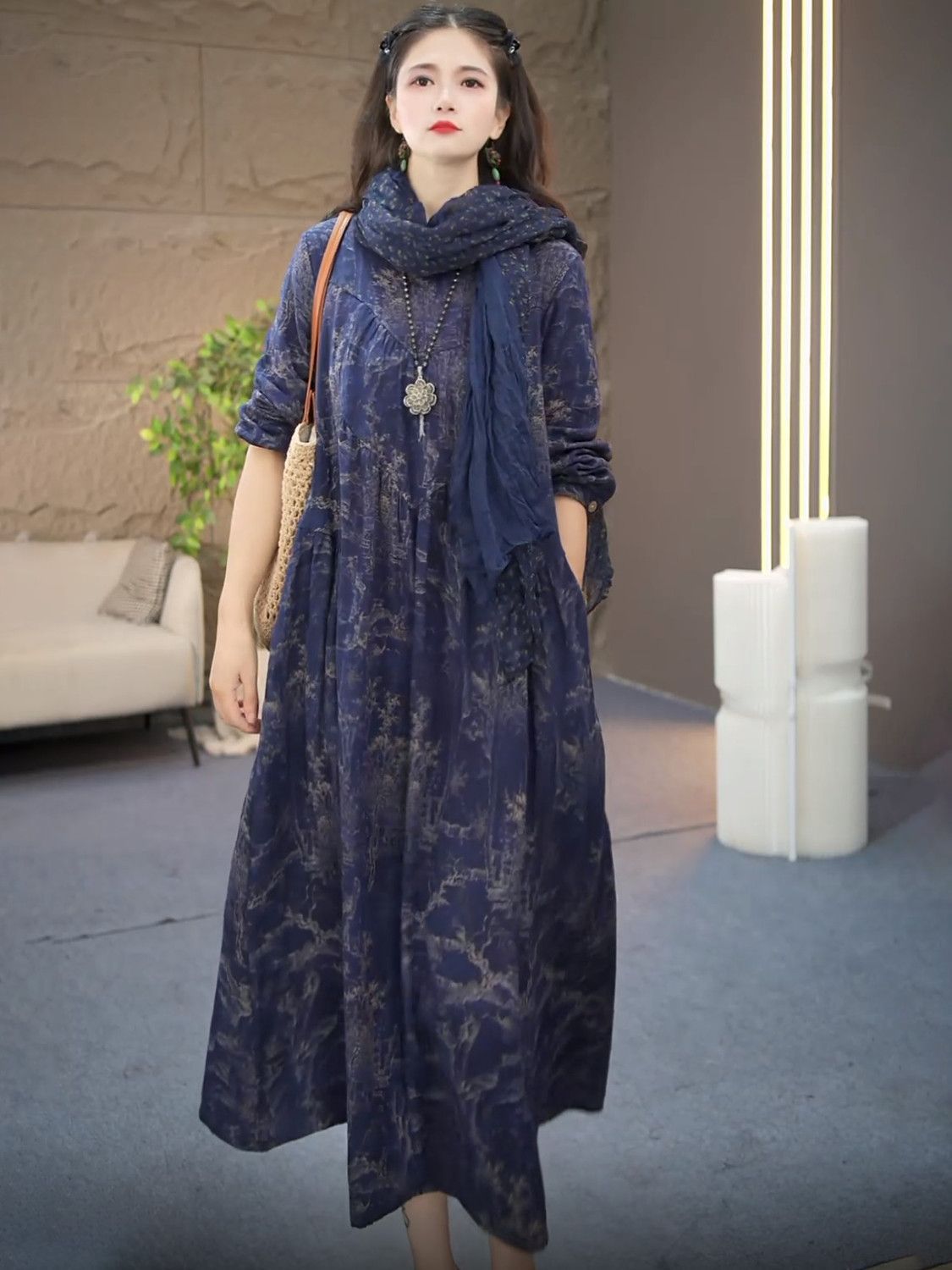 棉麻连衣裙文艺复古休闲风琴褶设计款长裙秋季新款长袖过膝大摆裙