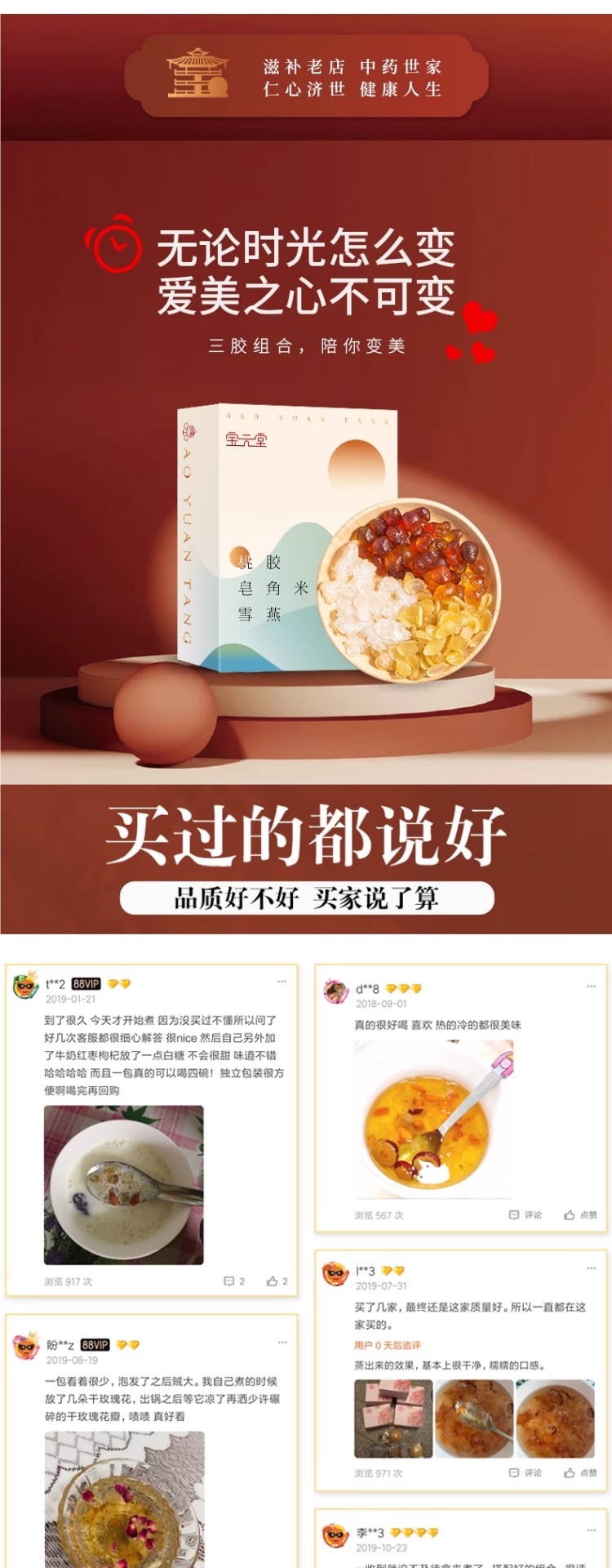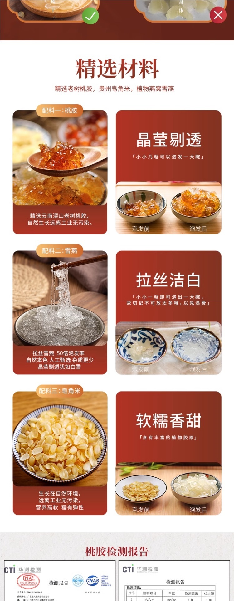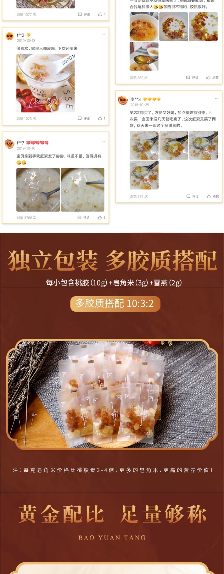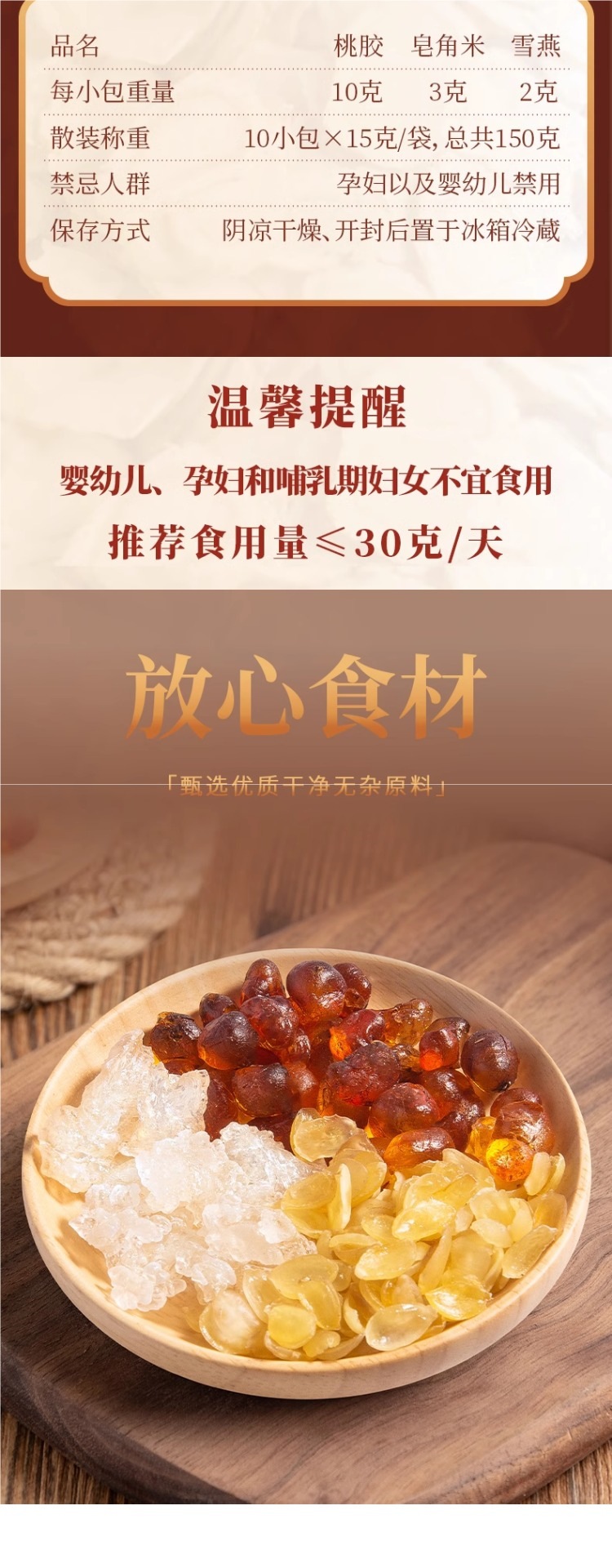 包装规格 桃胶雪燕皂角米组合1盒(尝鲜装),2盒40人次量(送红枣+枸杞+筛网),4盒80人次量(送红枣+枸杞+筛网+银耳),老树桃胶 250克,天然皂角米 200克,拉丝雪燕 250克,即食桃胶羹6碗礼盒装(2种口味各3碗)