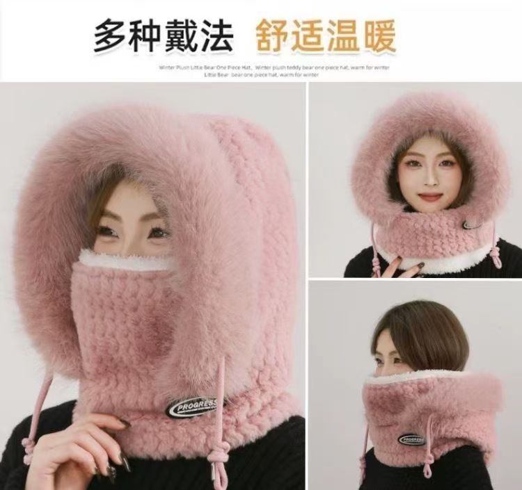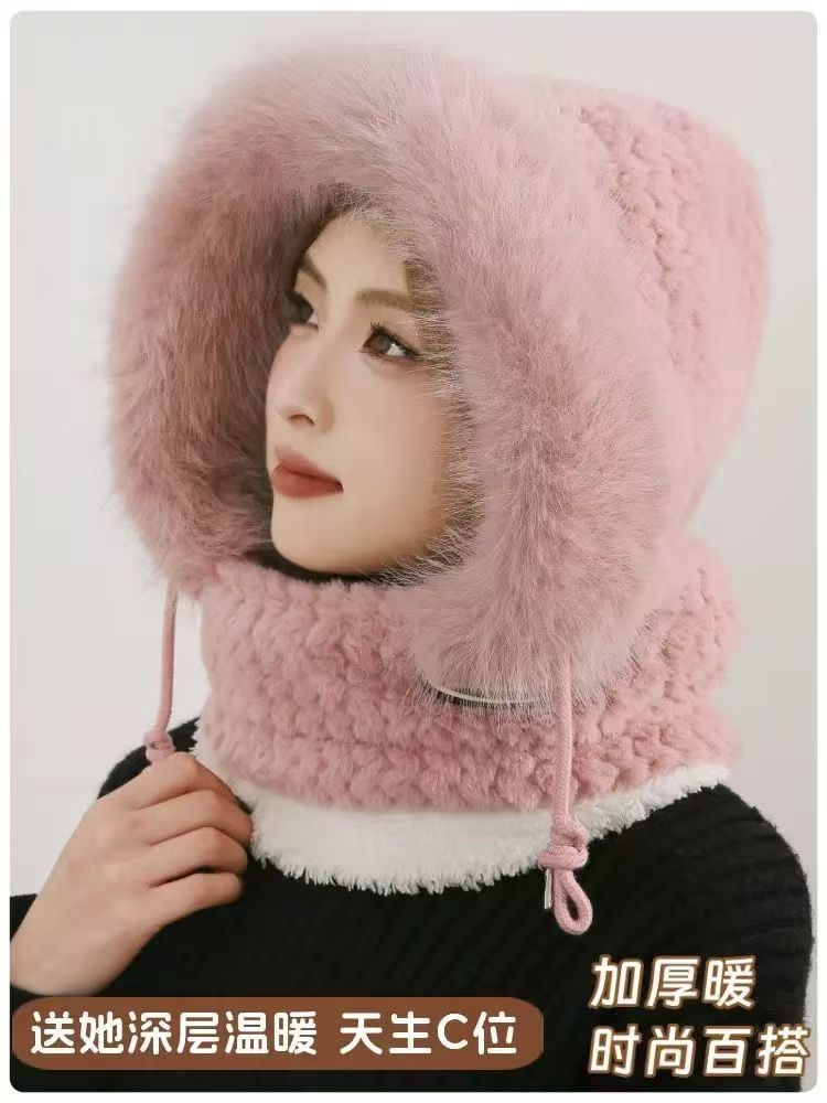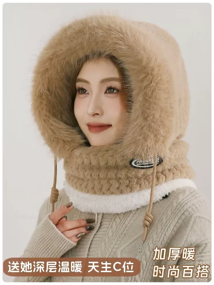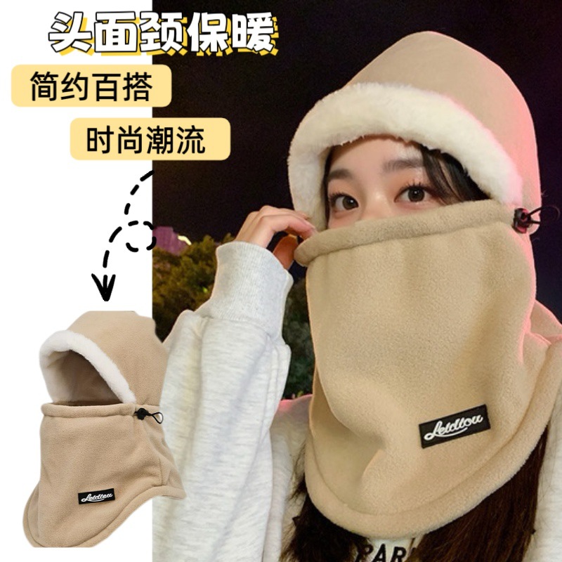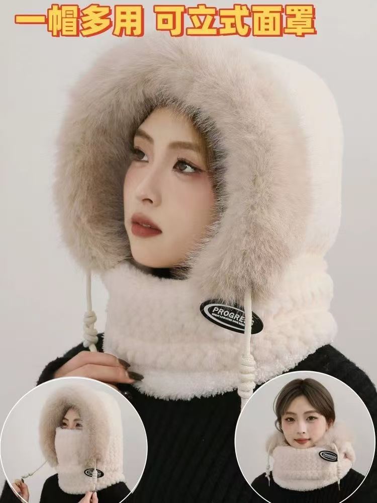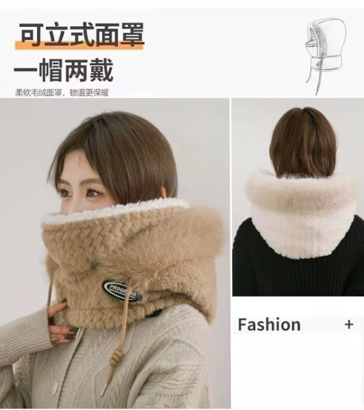 冬季连体帽女时尚通勤百搭套头帽双层加厚护耳保暖骑行御寒围脖帽
