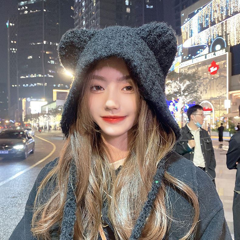 帽子女秋冬季韩版小熊耳朵毛线帽显脸小保暖冷帽大头围护耳针织帽