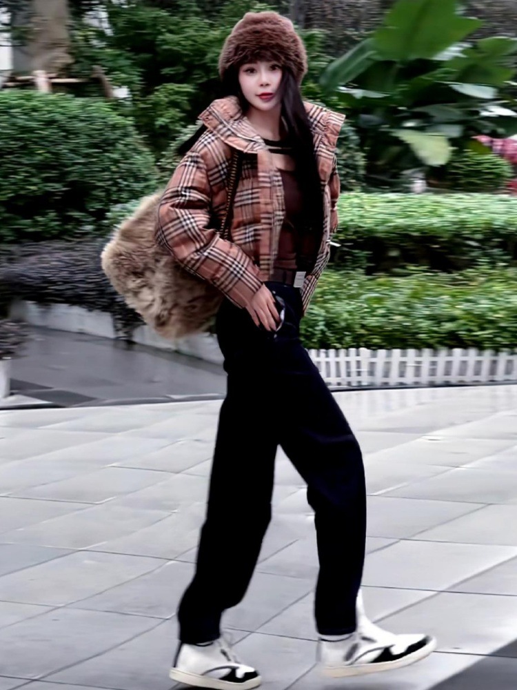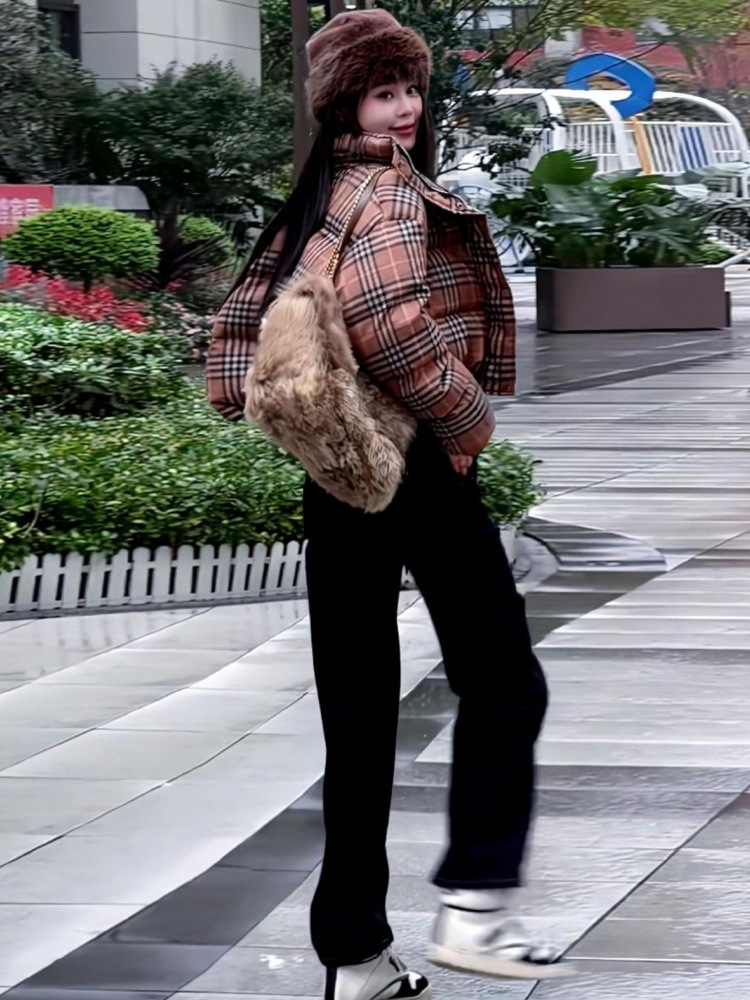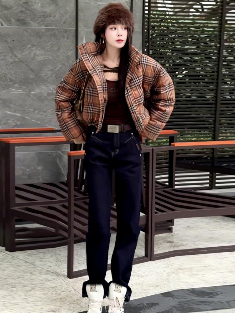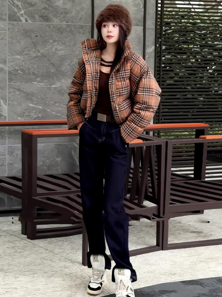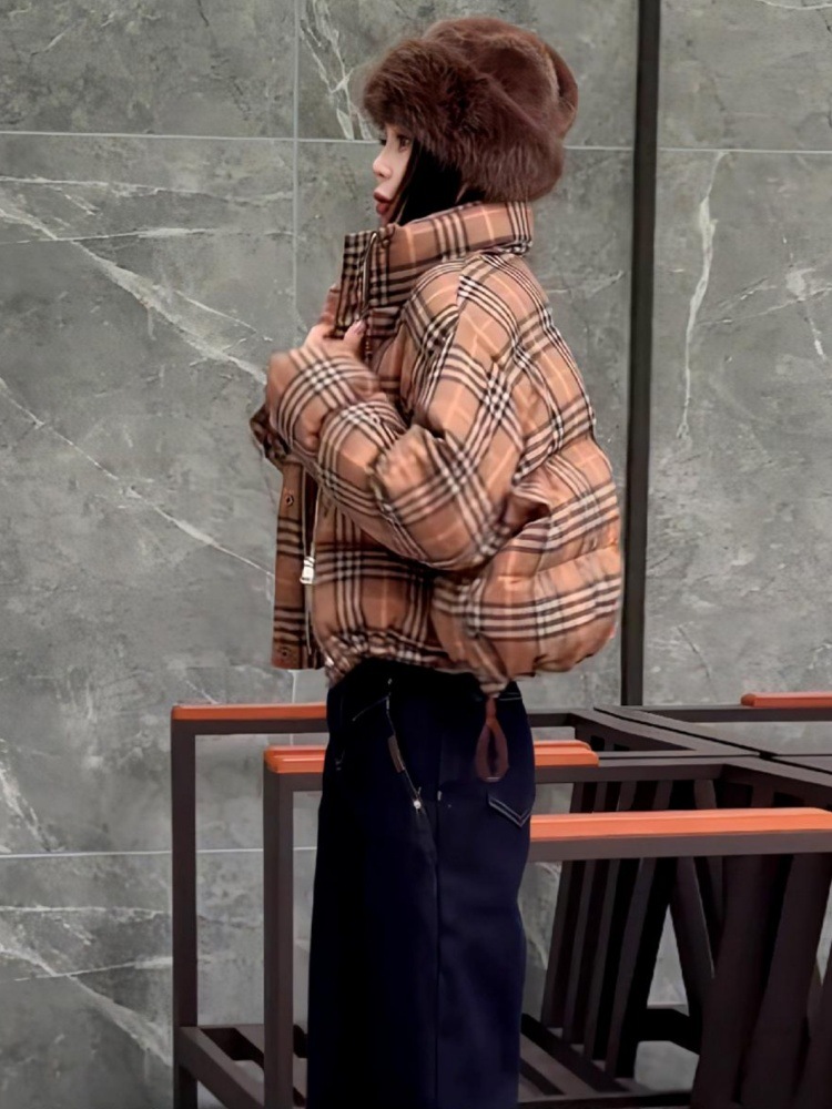 2025年冬季新款韩版格子小个子面包服时尚加厚保暖短款棉服女外套