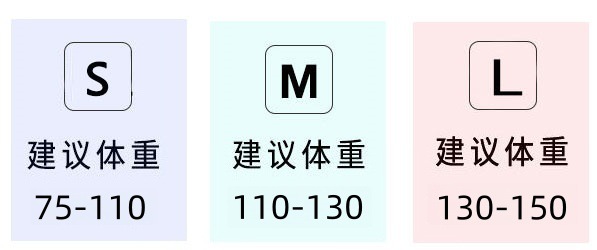 尺码 S(推荐75-110斤),M(推荐110-130斤),L(推荐130-150斤)