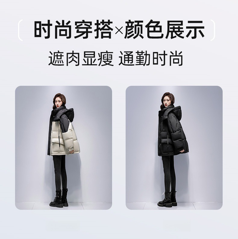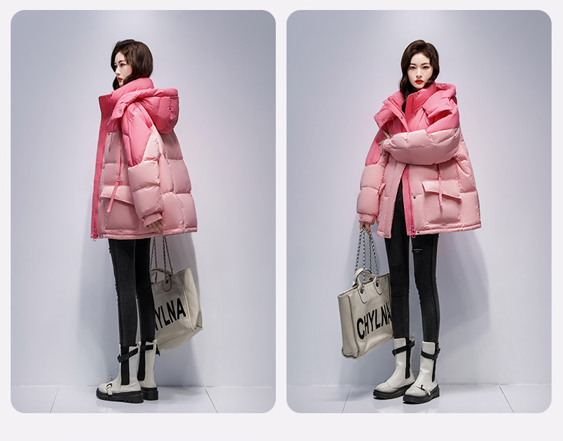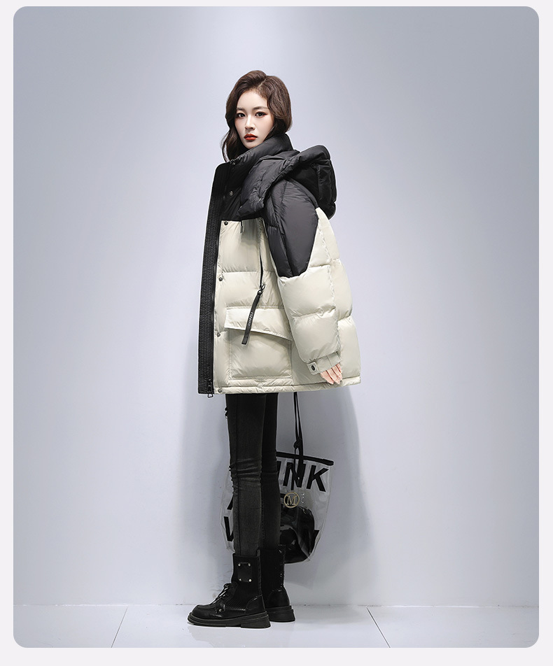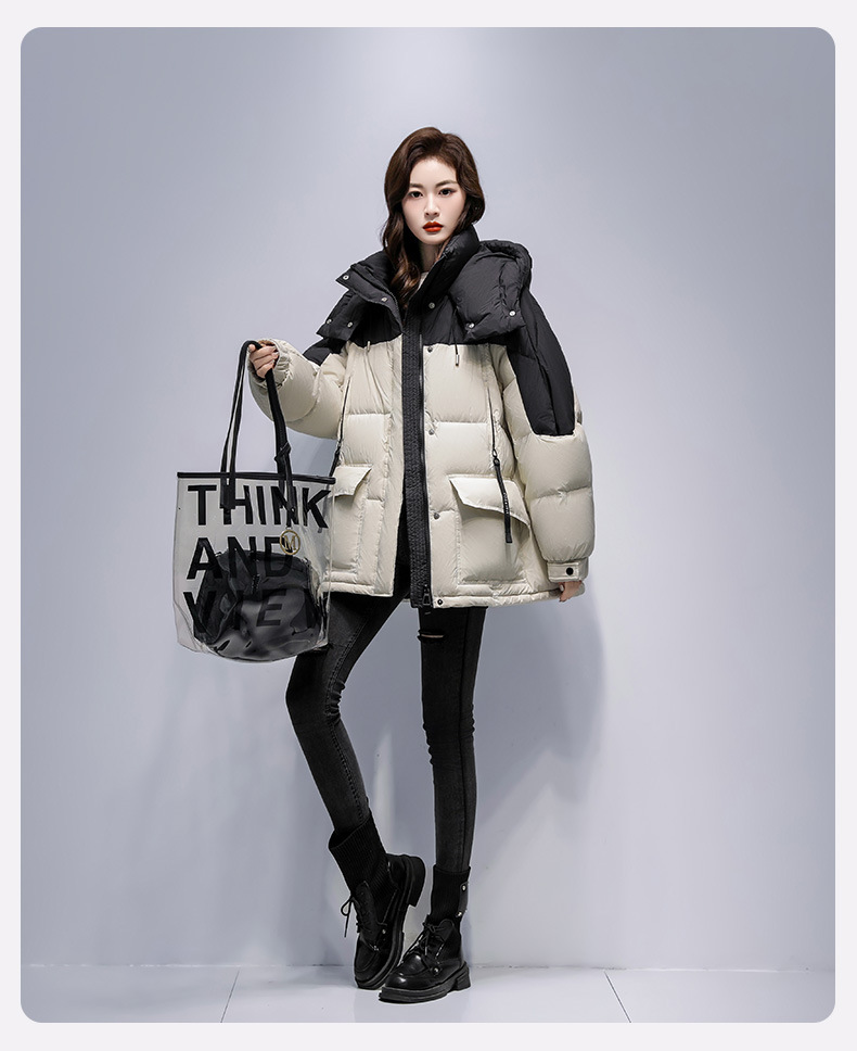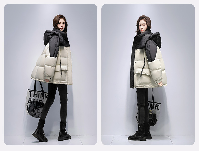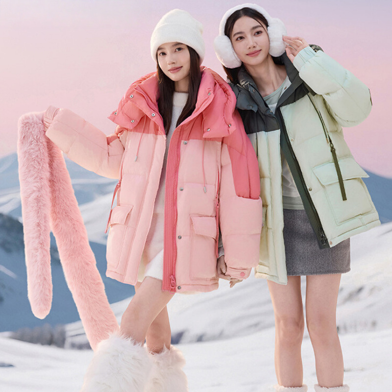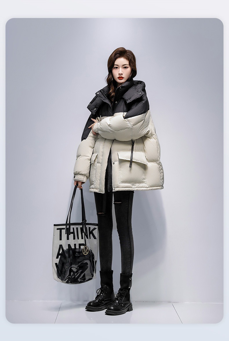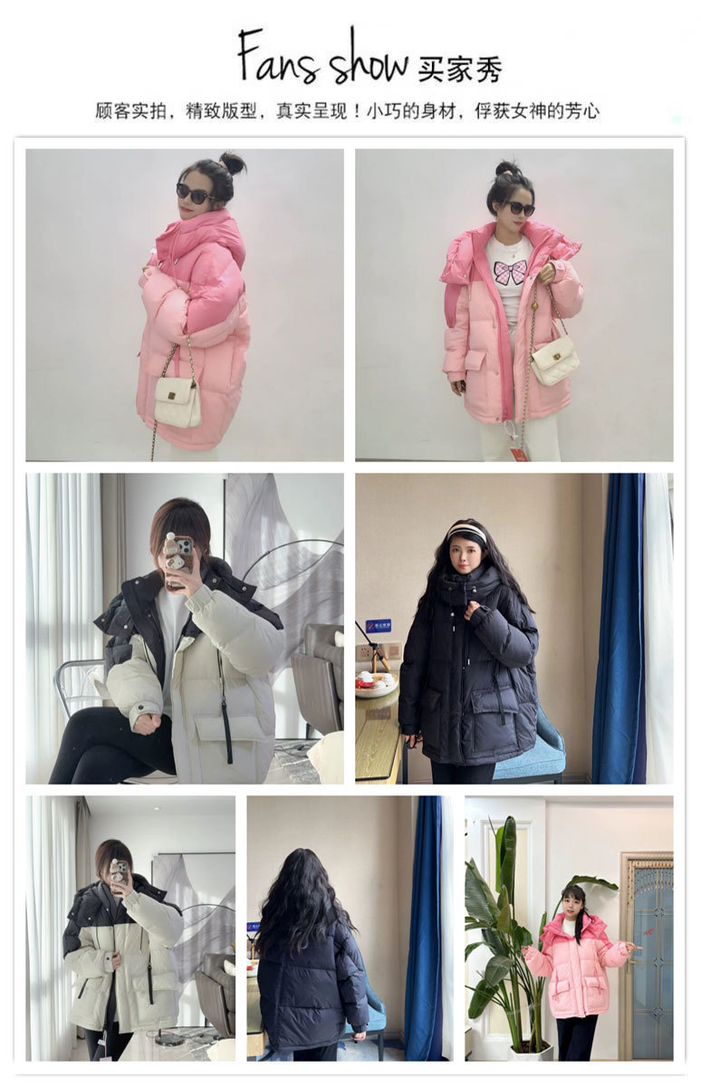 韩系时尚拼色连帽棉服女2025年冬季小个子穿搭面包服加厚宽松外套
