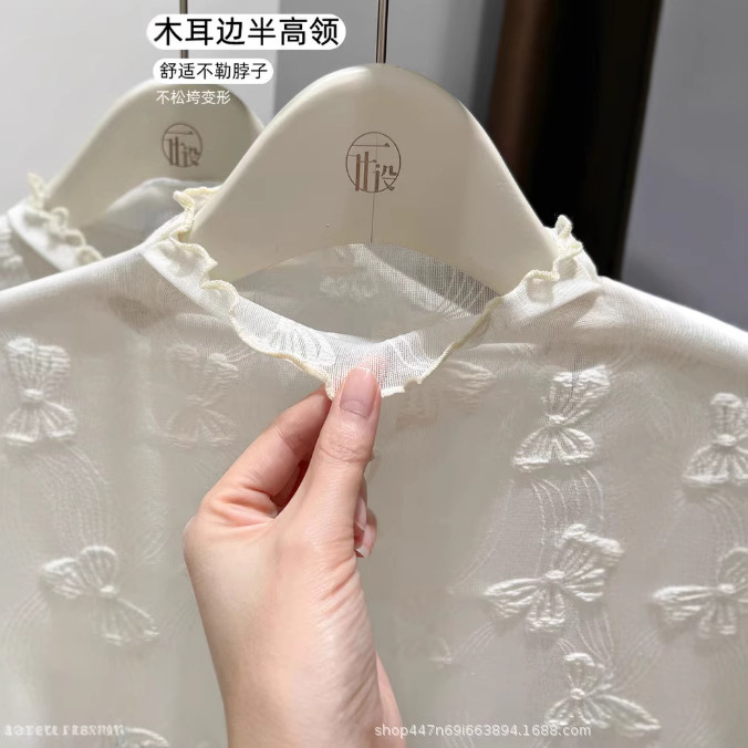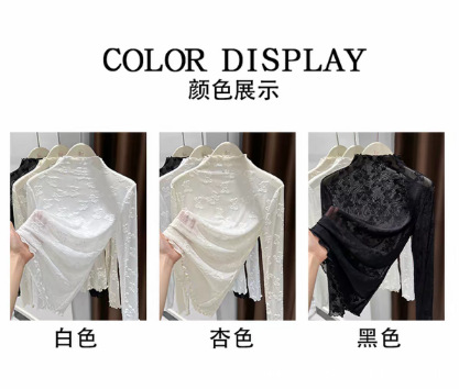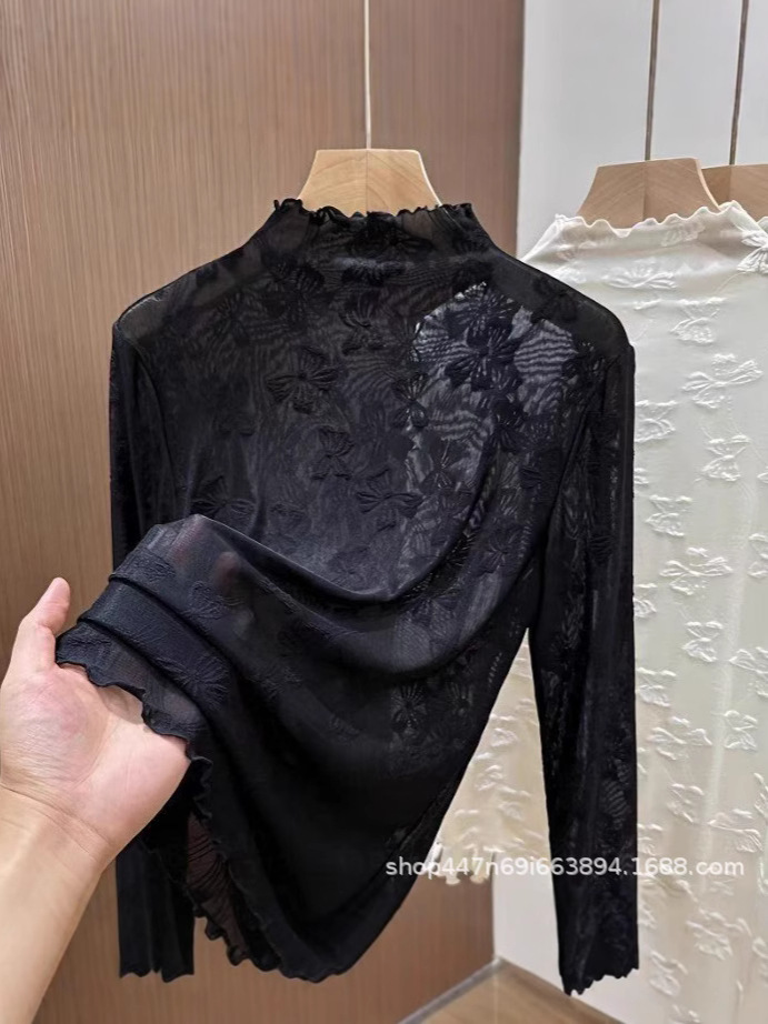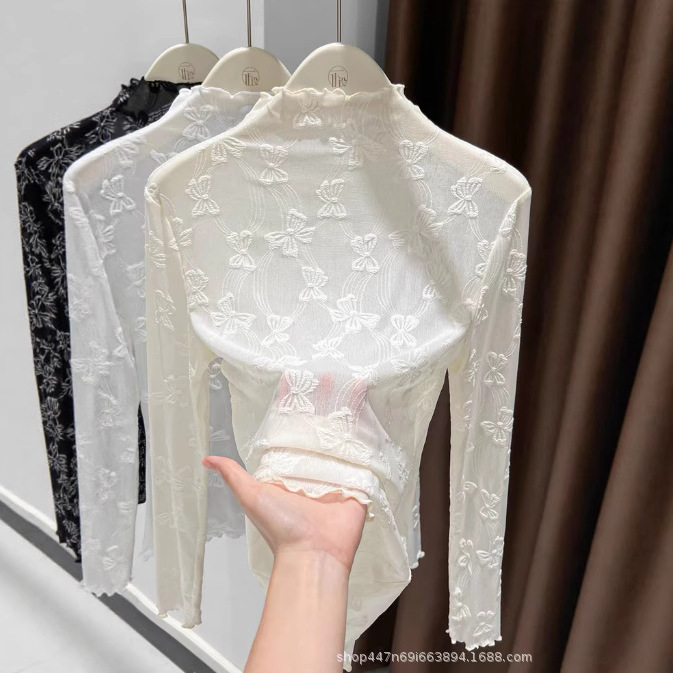 2025年新品边半高领薄纱打底衫女网纱长袖内搭春新款提花蕾丝上衣