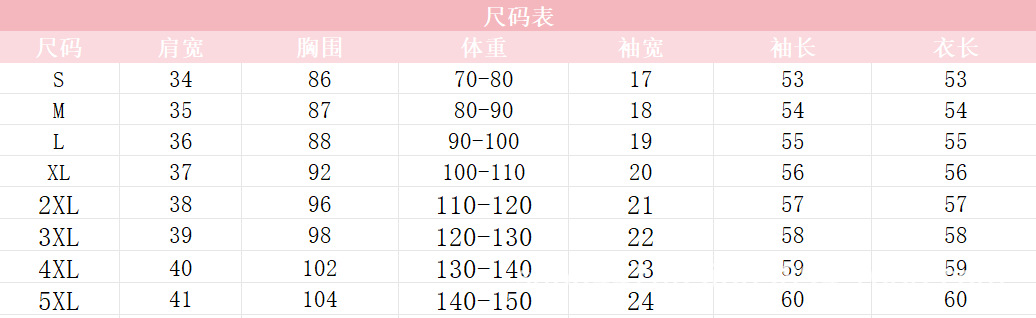 尺码 S(建议70-80),M(建议80-90),L(建议90-100),XL(建议100-110),2XL(建议110-120),3XL(建议120-130),4XL(建议130-140),5XL(建议140-150)