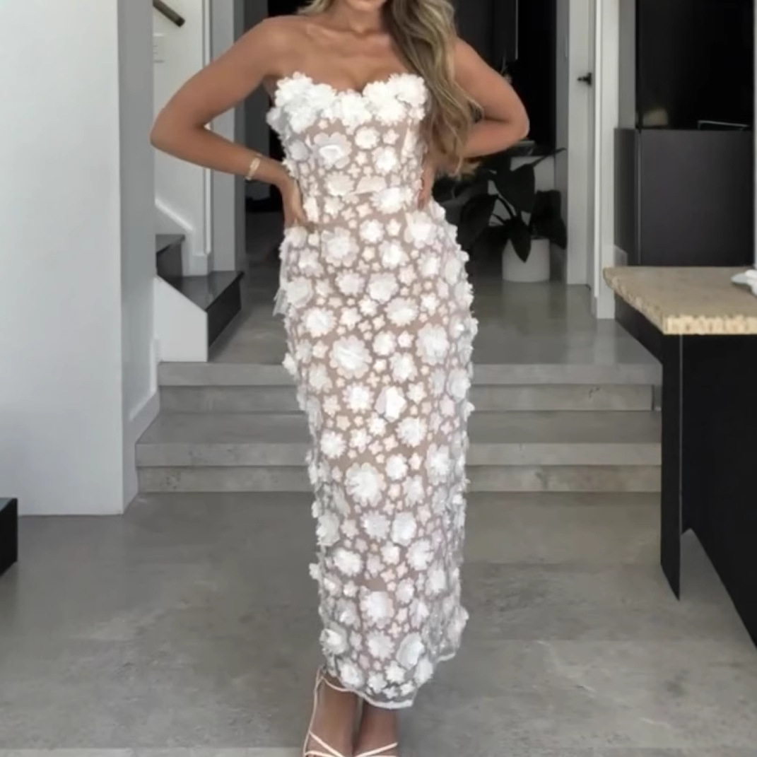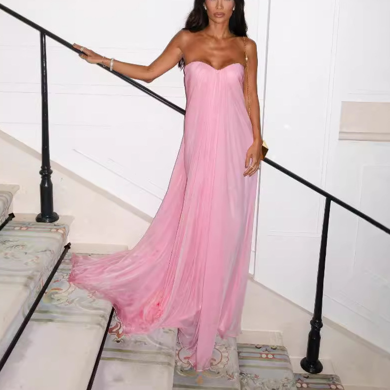 亚马逊热销晚礼服长裙新款收腰显瘦飘带抹胸气质连衣裙