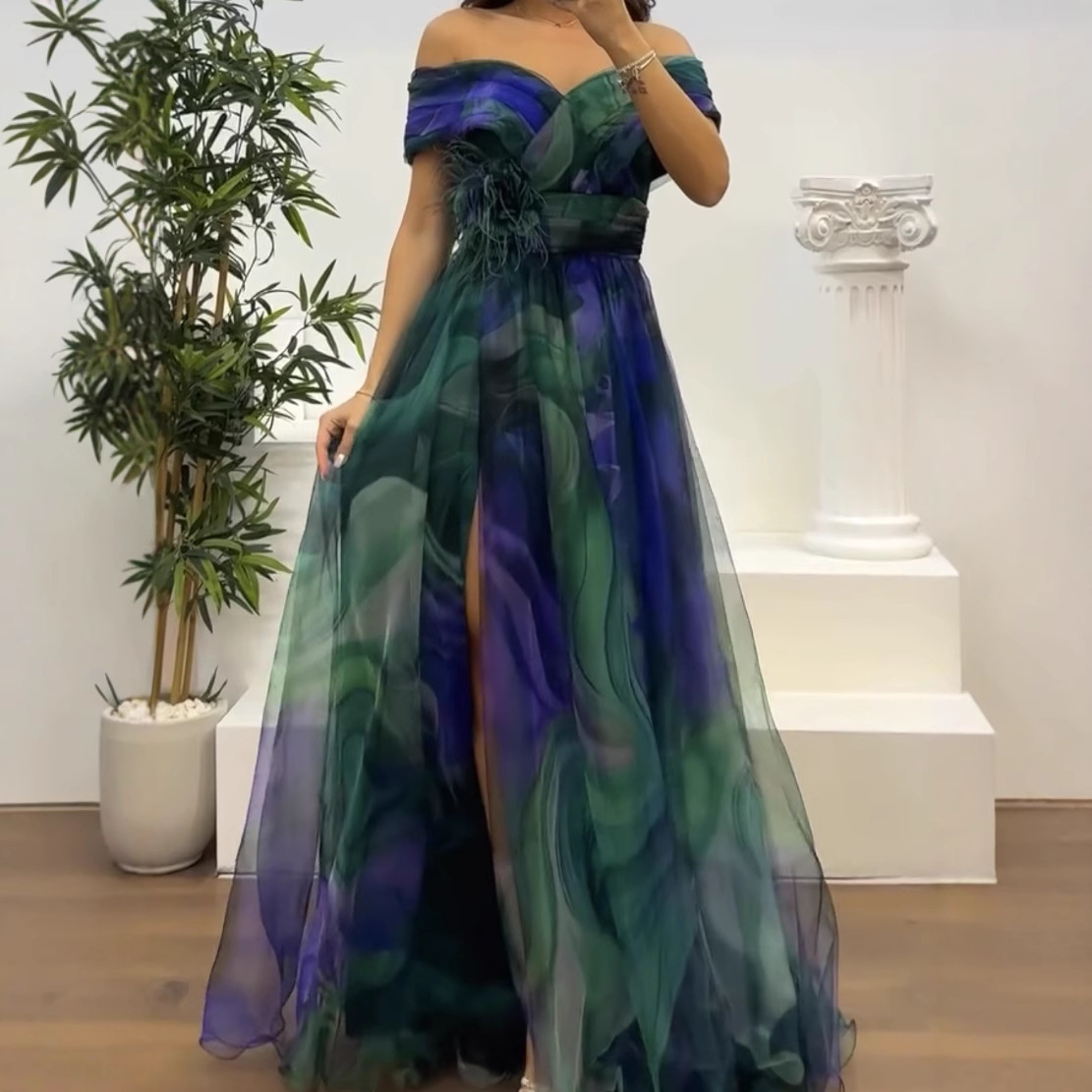 2025 春夏新作オフショルダーヨーロッパとアメリカのファッションシフォンプリント妖精ロング気質イブニングドレス