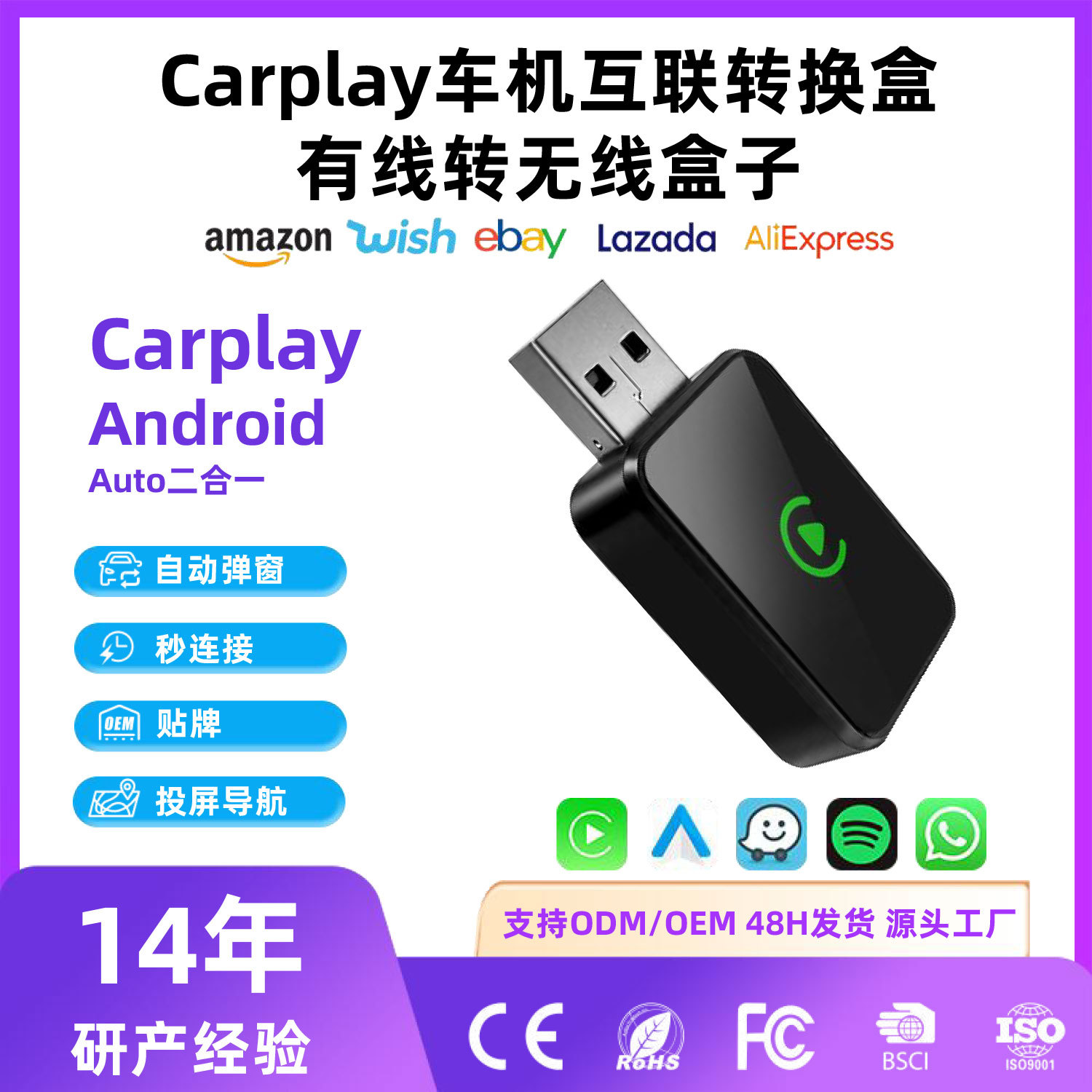 跨境原车有线转无线carplay互联盒android auto车载盒子车机盒子