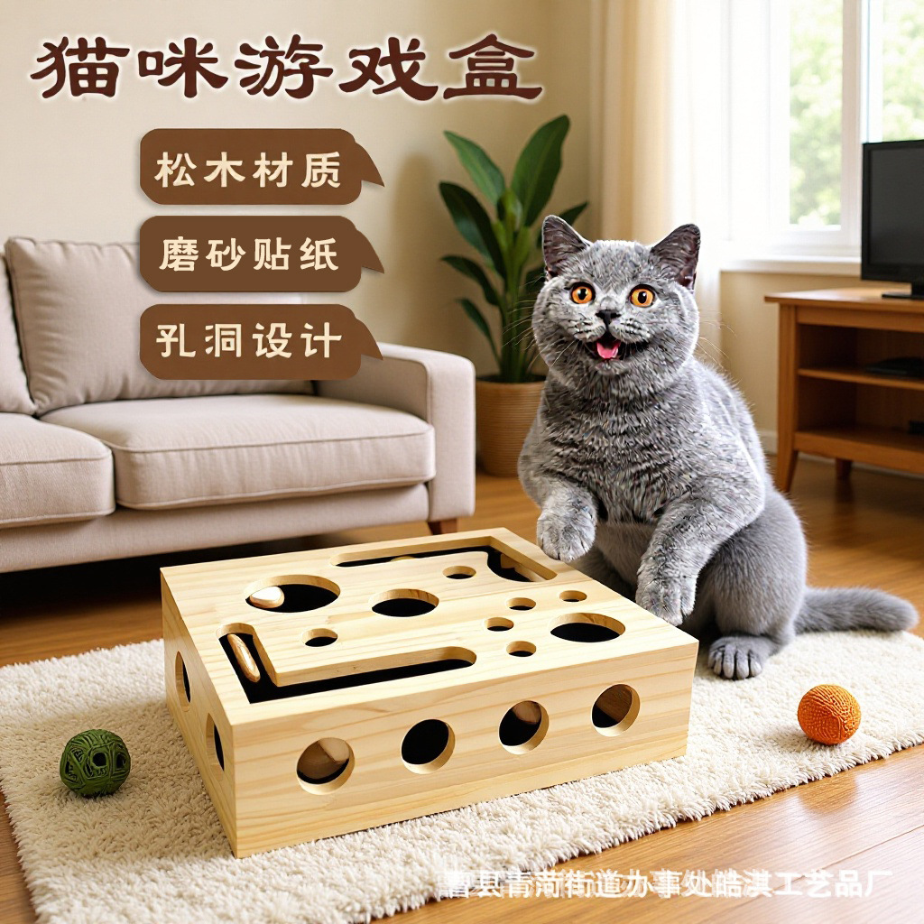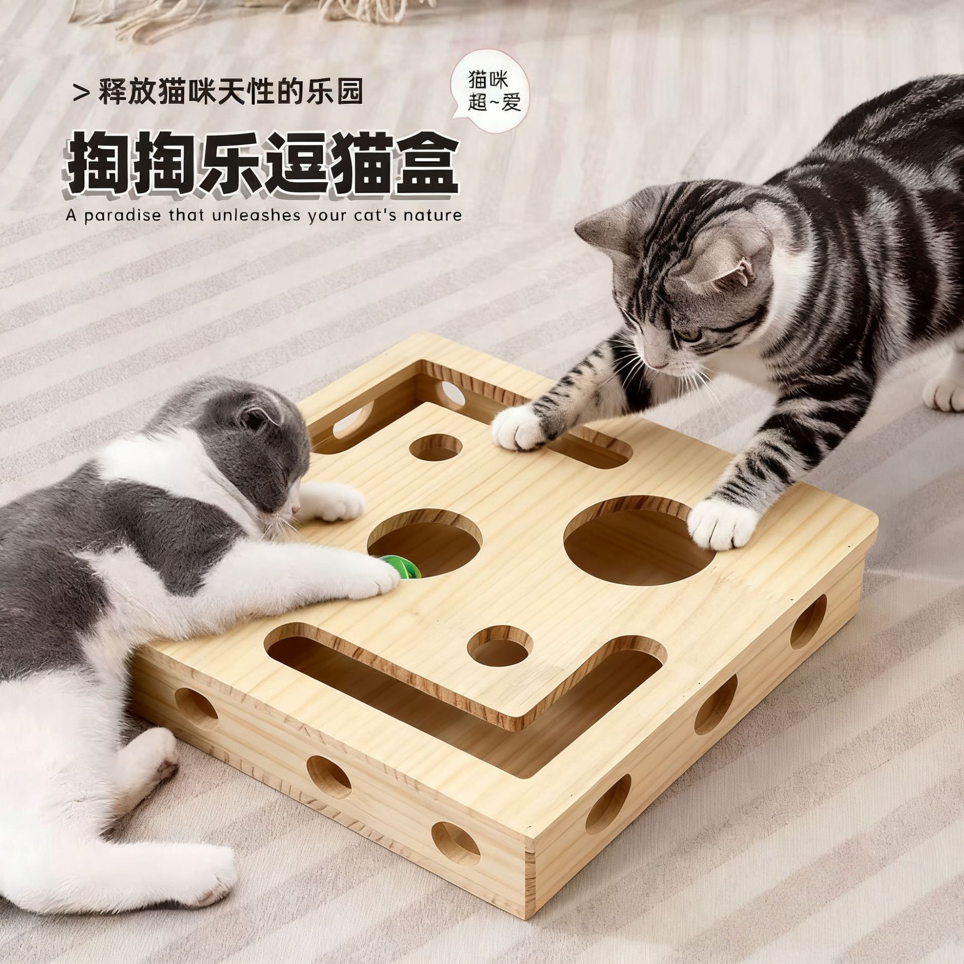 新款实木猫盒宠物玩具趣味迷宫猫咪自嗨解闷磨爪掏球游戏木质方盒