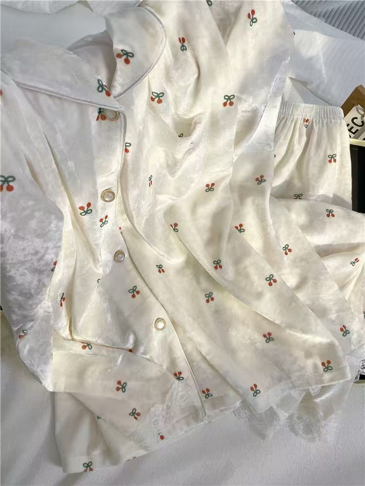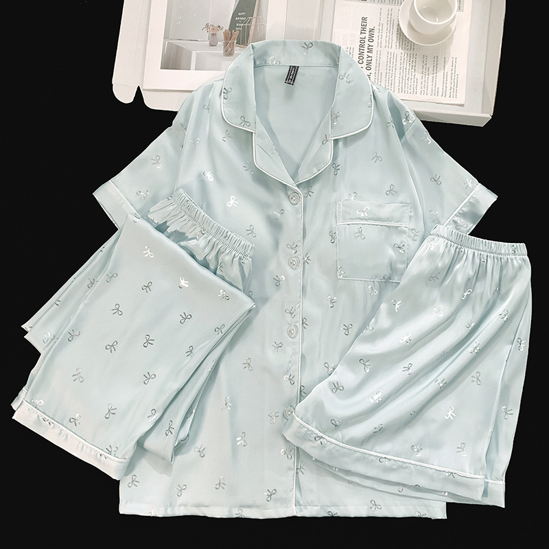 フレンチスタイルの新しいライト高級シルクパジャマ女性の夏の薄いカーディガン半袖ショーツスリーピースホームウェアセット