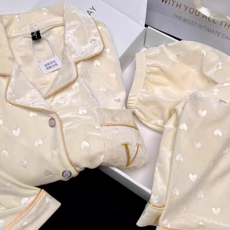 睡衣女爱心提花金丝绒秋冬季新款长袖带胸垫刘亦菲同款家居服套装