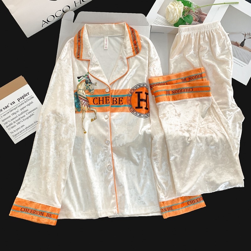 2024文字の軽い贅沢な小さな香りのベルベットのパジャマ女性秋冬の長袖の金ドリルのベルベットの家の服のスーツは生放送します