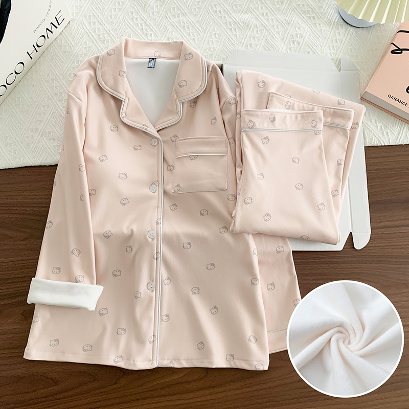 德绒加厚保暖秋冬新款胸垫休闲KT猫睡衣女长袖长裤家居服两件套装
