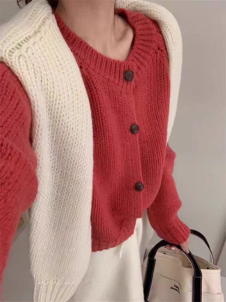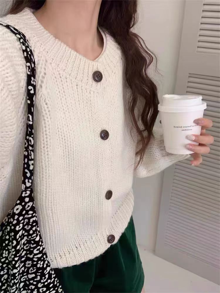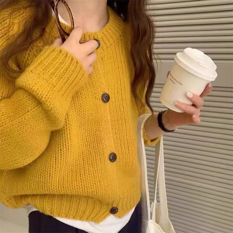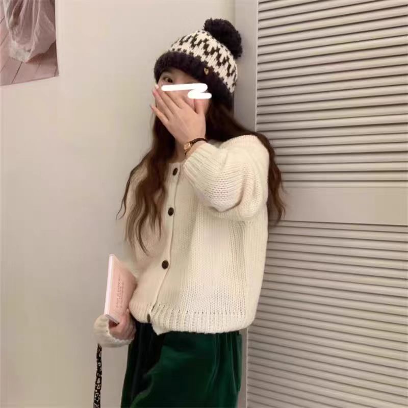 韩系风格复古羊毛开衫女宽松毛衣秋冬新款简约气质百搭加厚外套