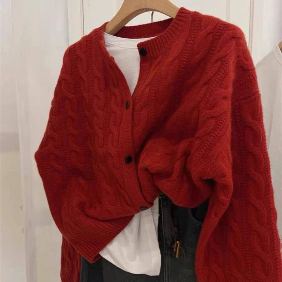 新年の赤い丸首の赤いカーディガン、女性用ヨーロッパ製秋冬カシミヤゆったり厚手ニットセータージャケット