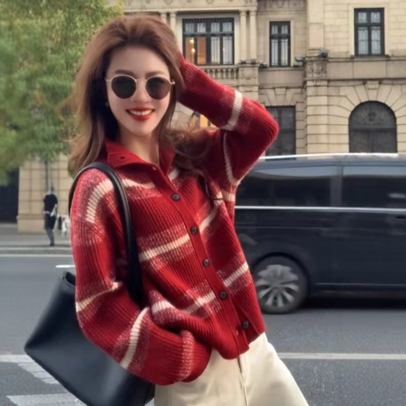 圣诞节氛围感穿搭羊毛衫女新年红色条纹毛衣开衫秋冬宽松针织外套