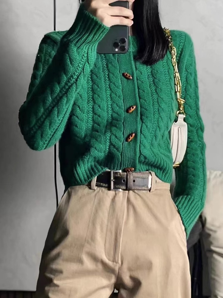 25年秋冬100ウールセーターレディースカーディガンジャケット厚みのあるレトロシングルブレストラウンドネックセーターツイスト