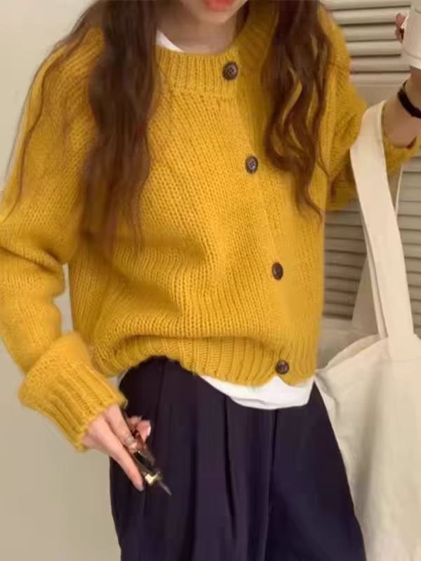 2025韓国版秋冬ウールカーディガン女性コート麻花丸首厚手純色セーターカシミヤニット外付け