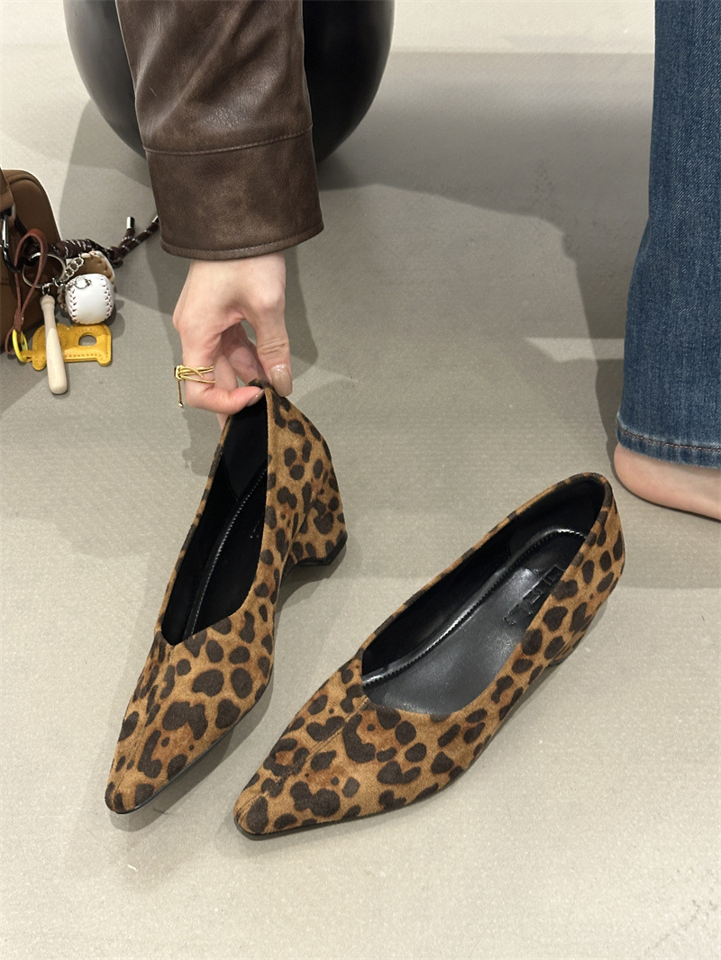 小众韩版复古尖头浅口单鞋女2025秋冬新款时尚通勤豹纹粗跟鞋女鞋