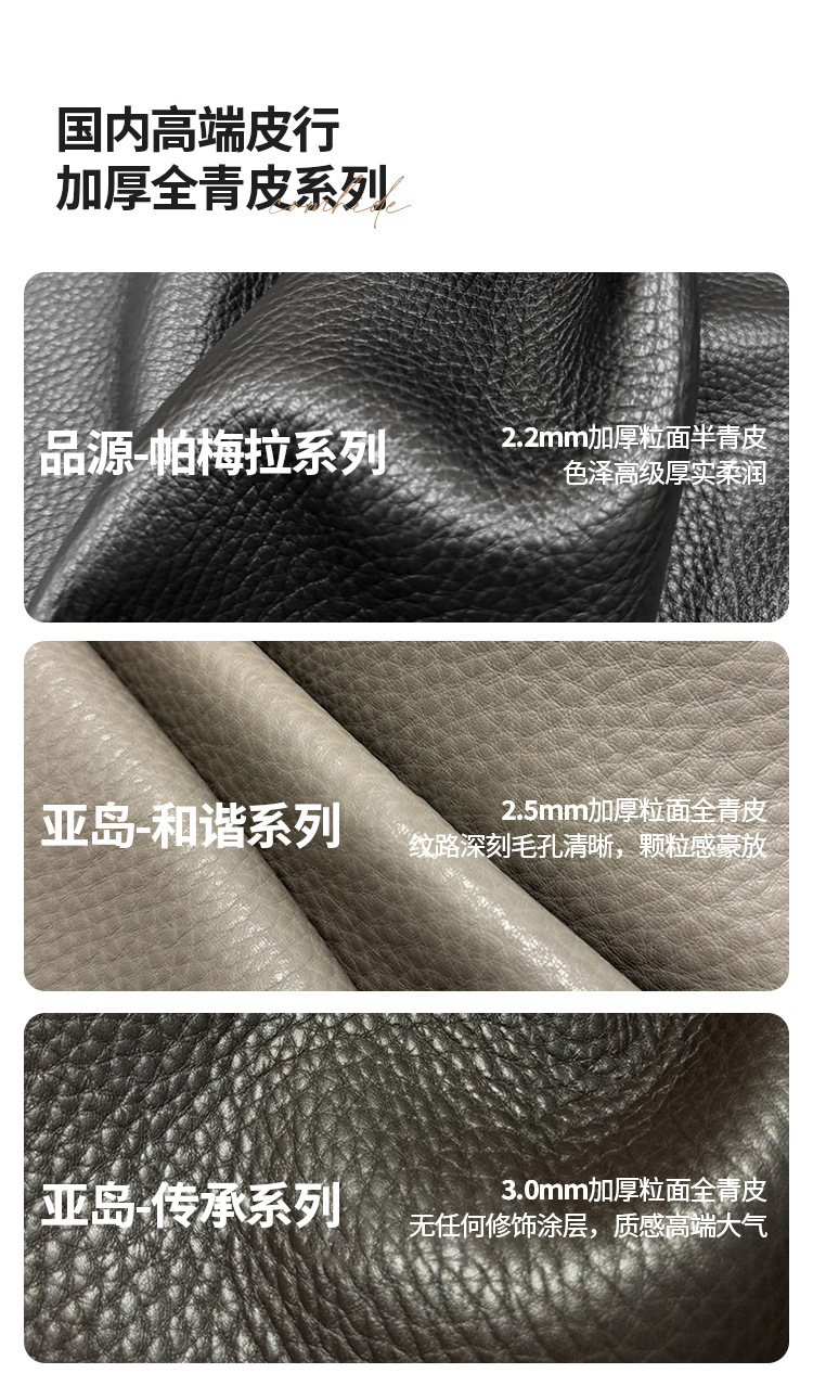 洋东祥云系列【摔纹皮】1.6mm 11.8元/尺,洋东米洛提系列【半青皮】1.6mm 11.8/尺,时增米洛提飞天茅台系列【半青皮】1.8mm 18.8元/尺,时增银河系列【全青皮】中厚2.0mm 30元/尺,品源帕梅拉【半青皮】中厚2.2mm18.8元/尺,亚岛和谐【全青皮】中厚2.5mm 24.8元/尺,亚岛传承【全青皮】加厚3.0mm 38.8元/尺