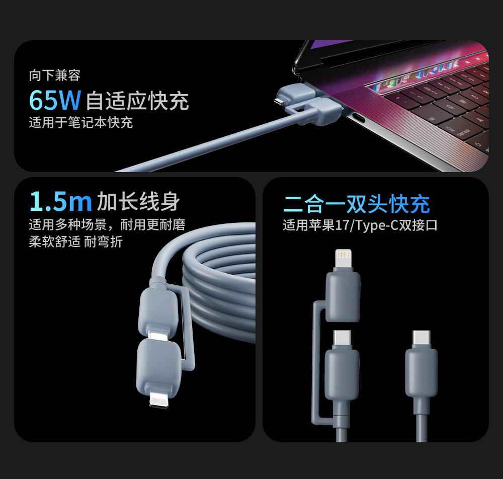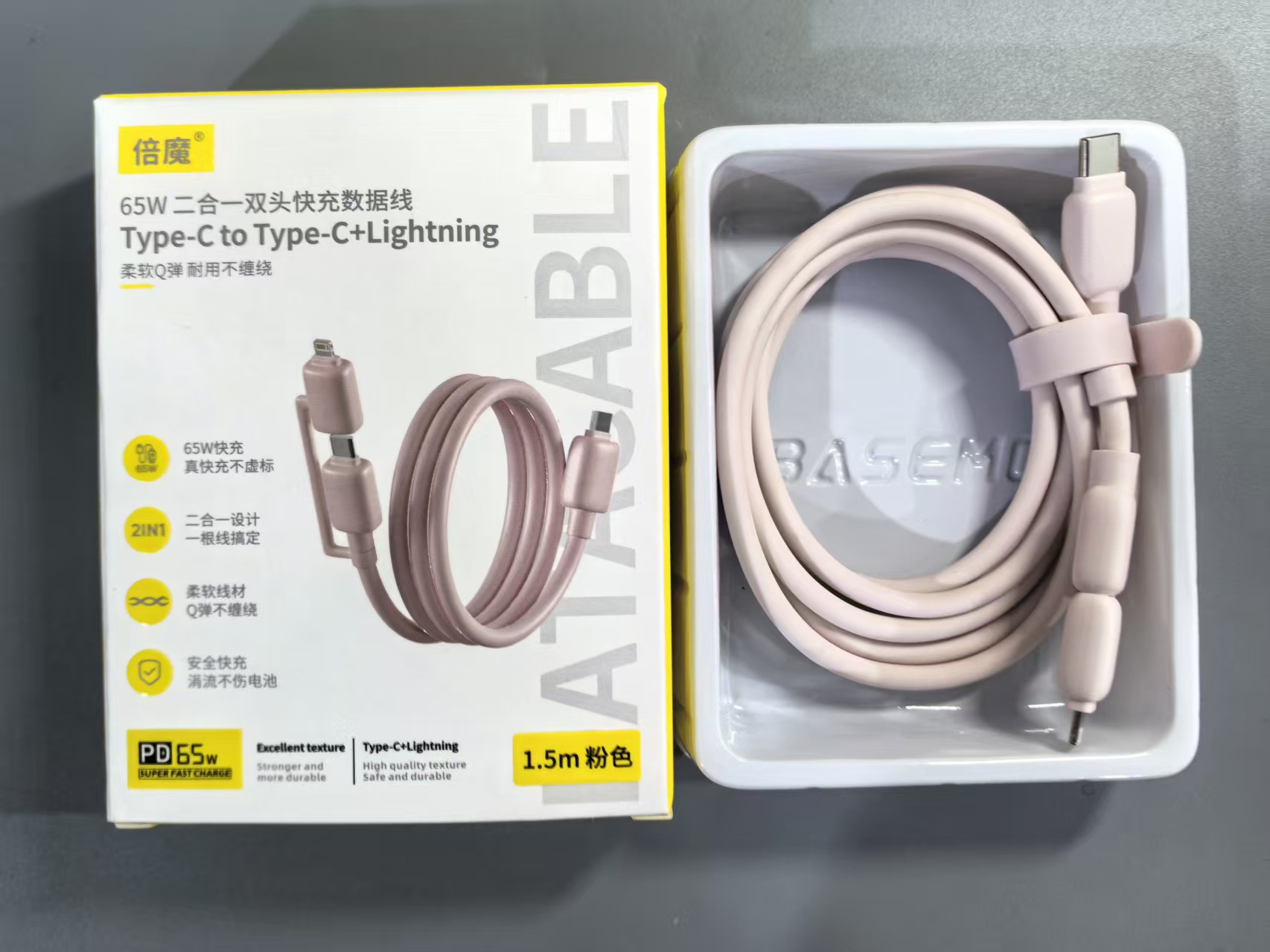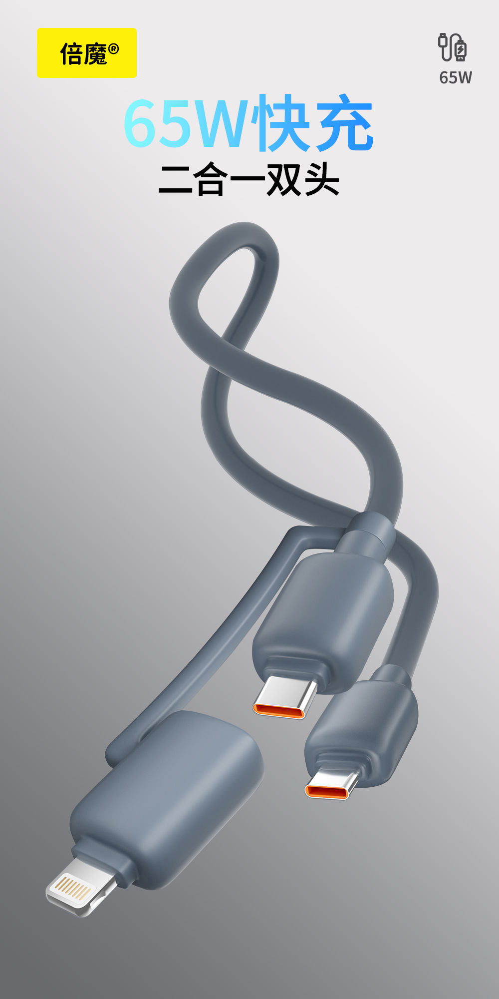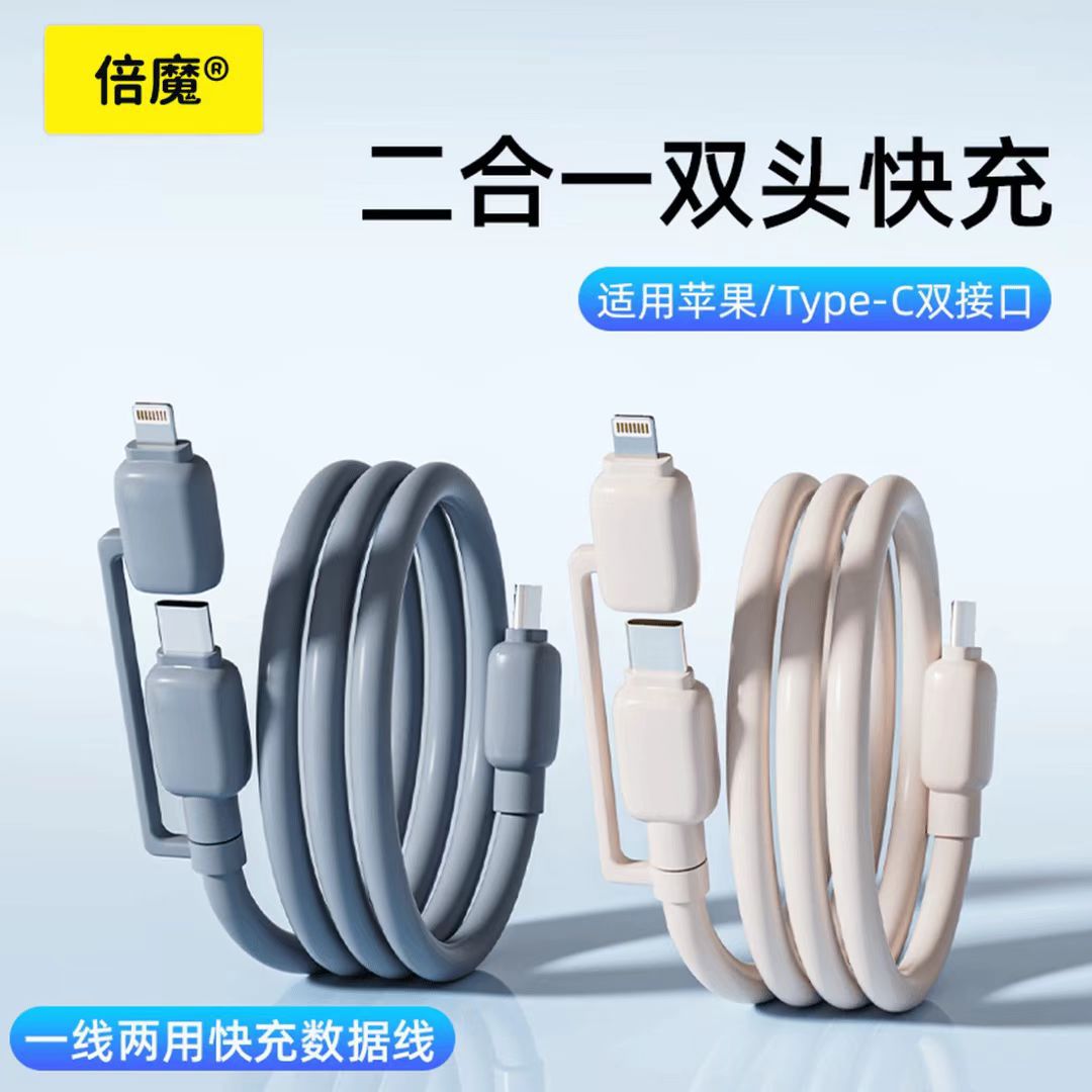 【实力工厂】倍魔65W二合一双头快充数据线适用苹果8-17华为安卓.