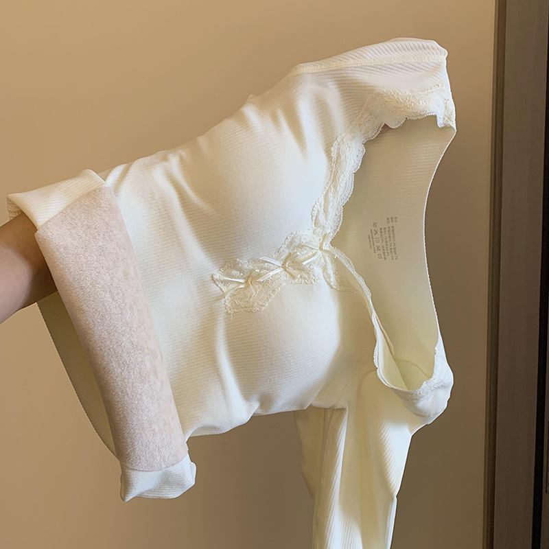発熱保温上着の女性は秋冬に胸パッドとベルベットを持って長袖vネックレースのシャツの中の服を厚くした