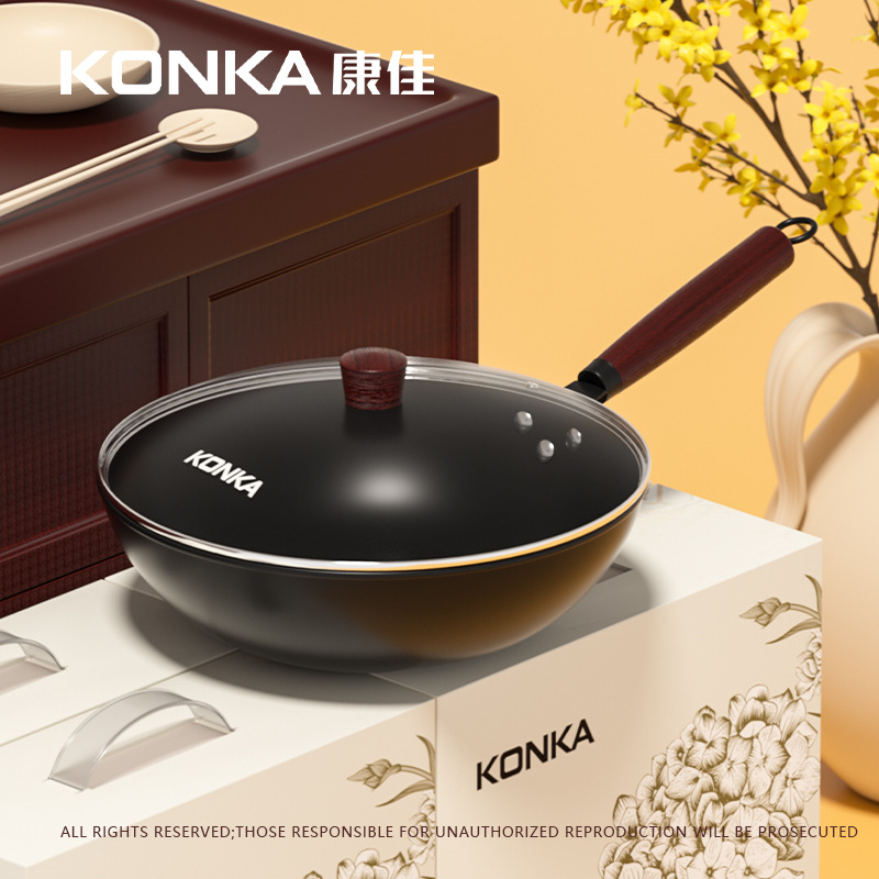 康佳无涂层炒锅家用大容量炒菜锅纯精铁不粘锅煎炒锅耐磨平底锅具