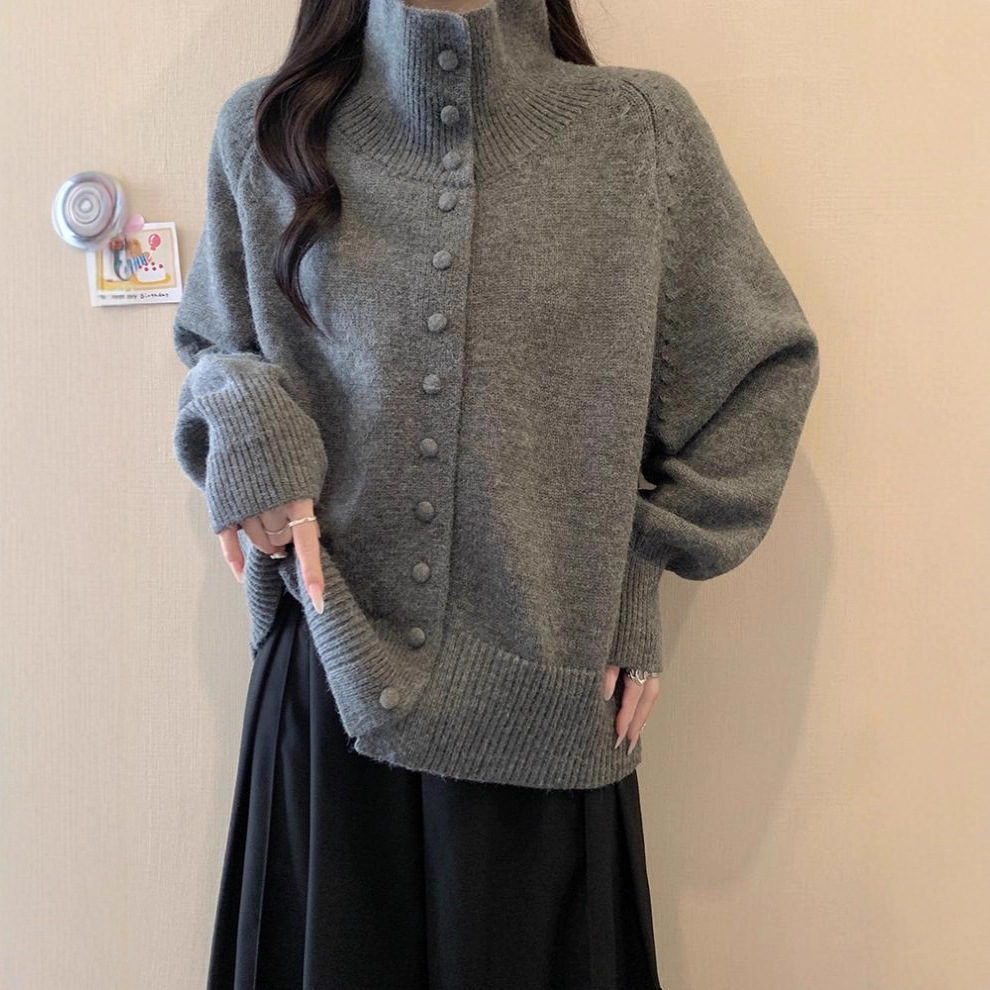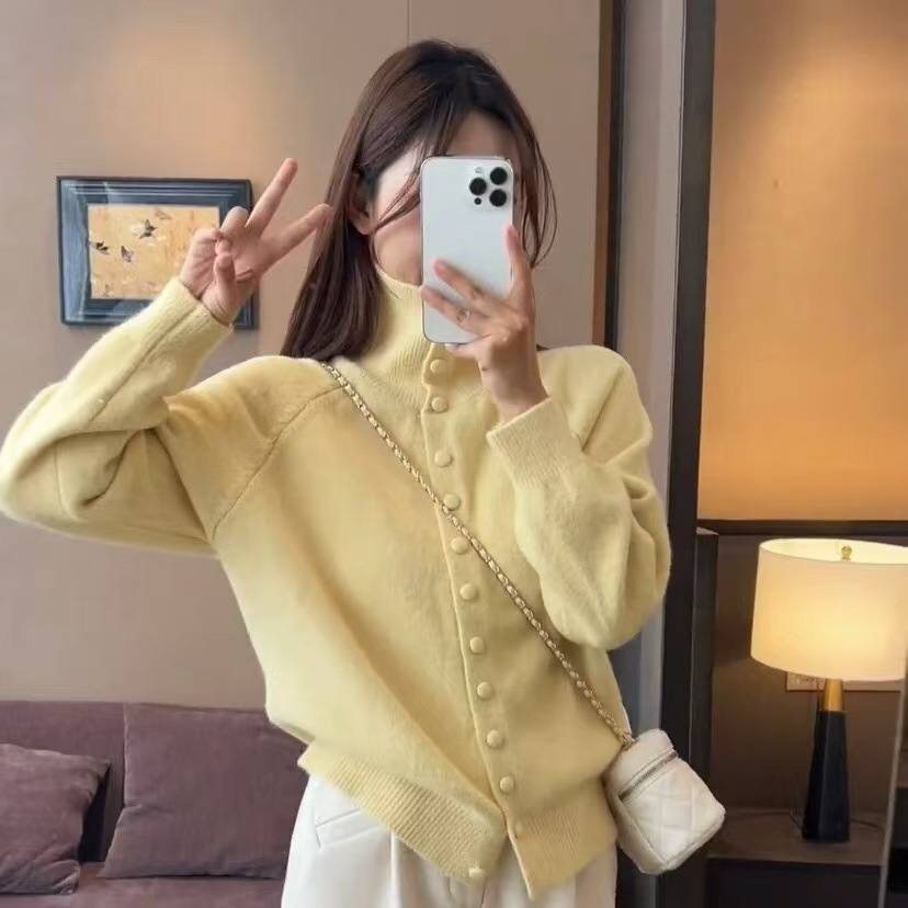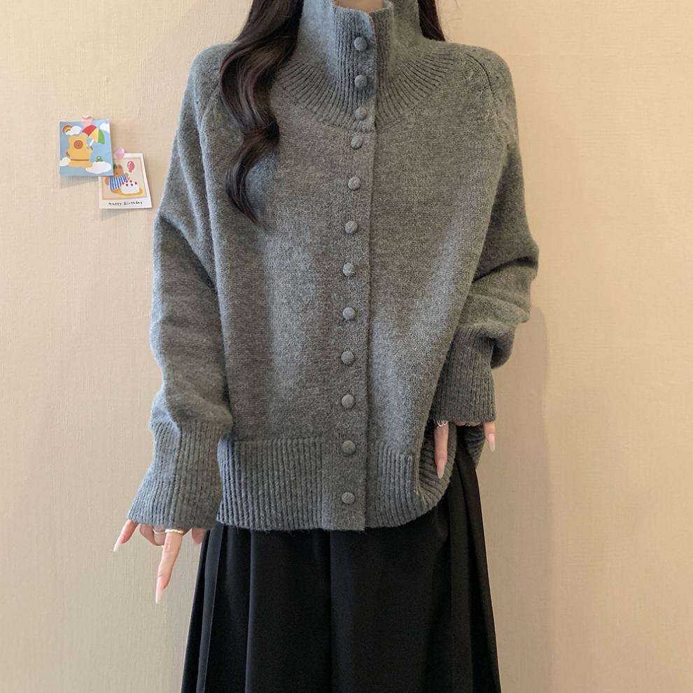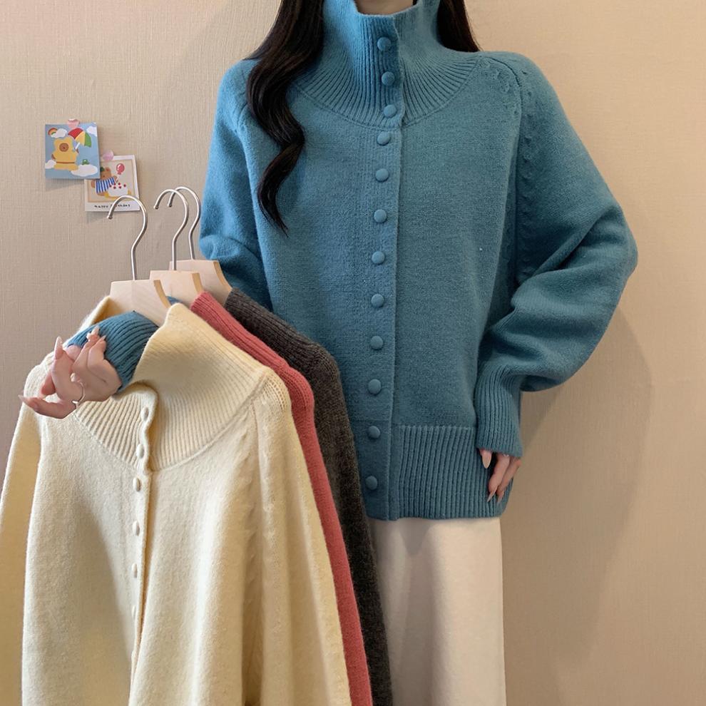 韩系半高领单排扣纯色针织开衫女2025秋冬季新款宽松百搭毛衣上衣