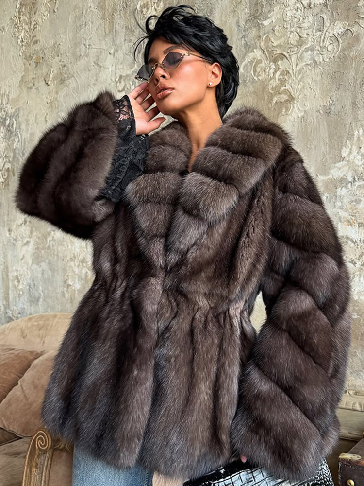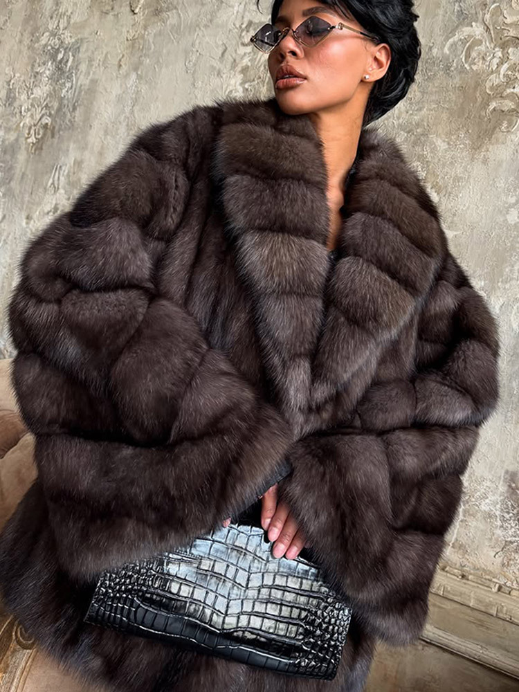 实拍-气质高级感拼接翻领长绒皮草外套2025跨境欧美风秋冬新款