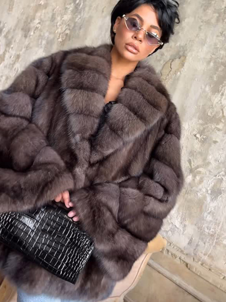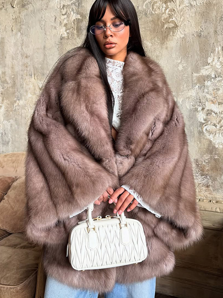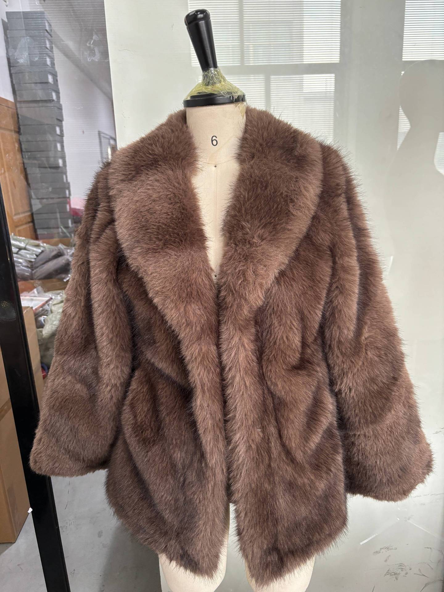 外贸跨境欧美风秋冬翻领仿皮草外套女蓬松毛绒狐狸毛环保皮草批发
