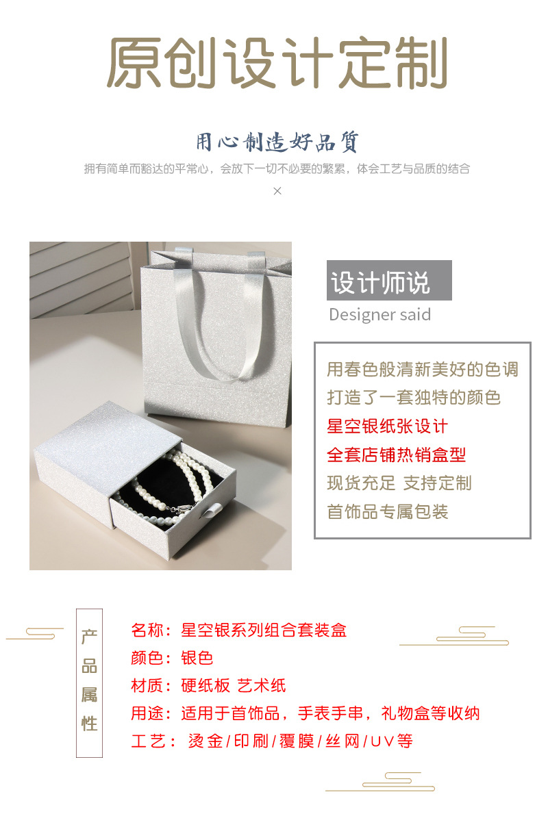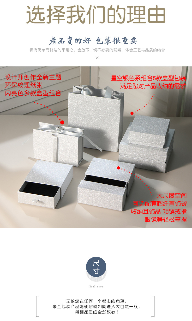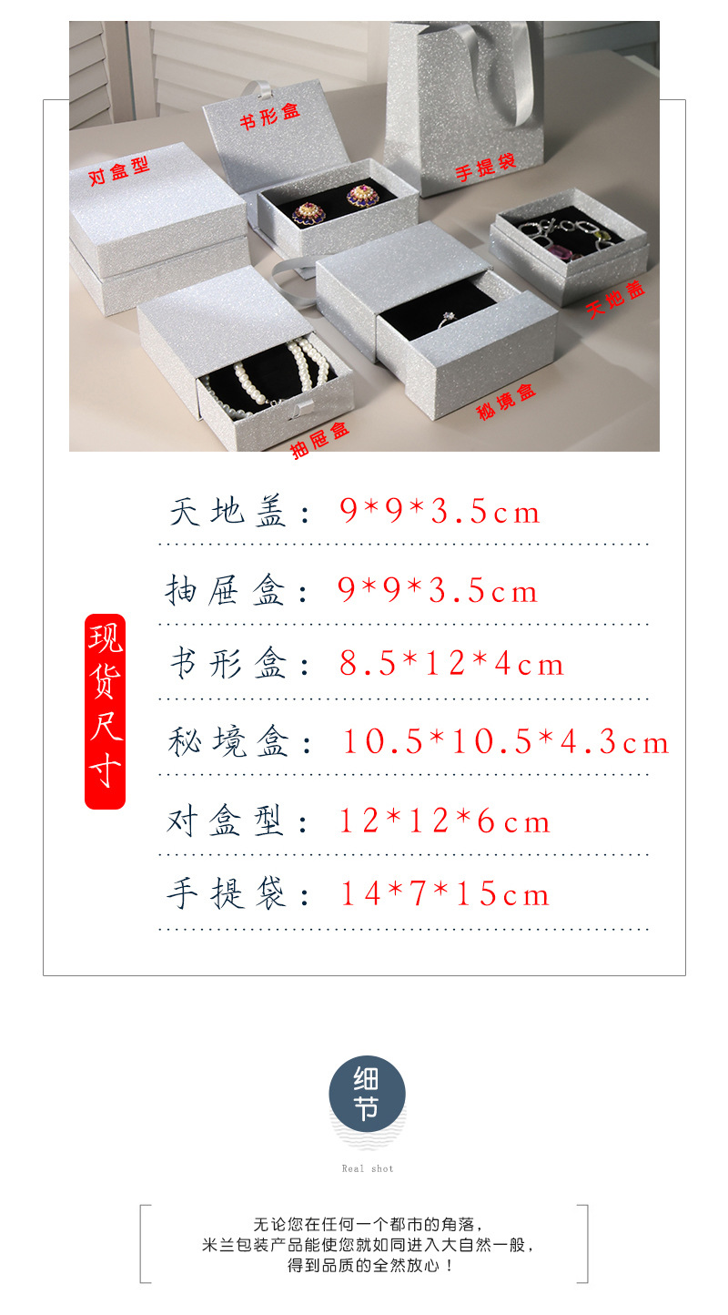 规格型号 星空银天地盖;外径9*9*3.5cm(配绒布海绵),星空银抽屉盒;外径9*9*3.5cm(配绒布海绵),星空银书形盒;外径8.5*12*4cm(配绒布海绵),星空银秘境盒;外径10.5*10.5*4.3cm(空盒),星空银秘境盒;外径10.5*10.5*4.3cm(配绒布海绵),星空银秘境盒;外径10.5*10.5*4.3cm(配黑色悬浮盒),星空银对盒型天地盖;外径12*12*6cm(空盒),星空银手提袋;外径14*7*15cm