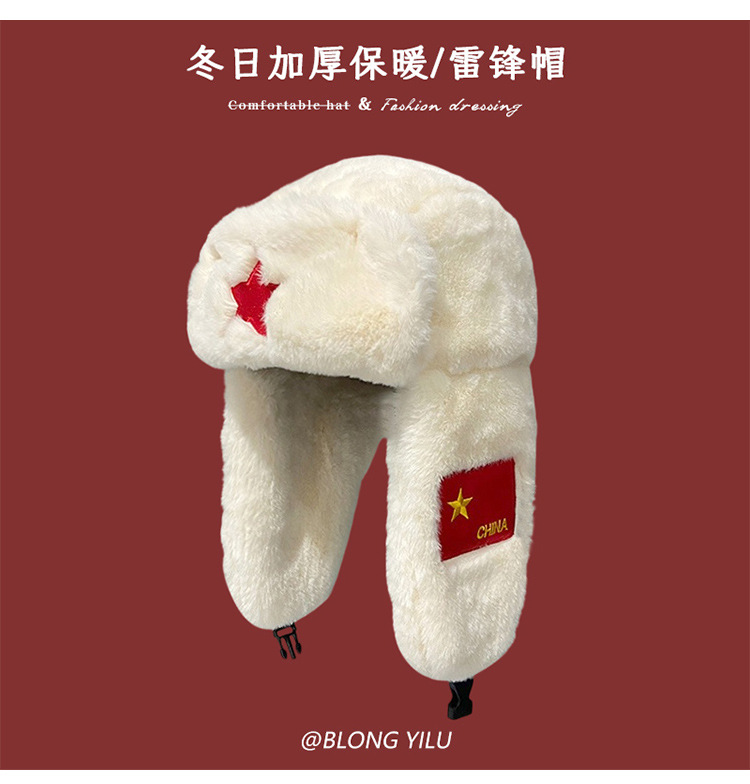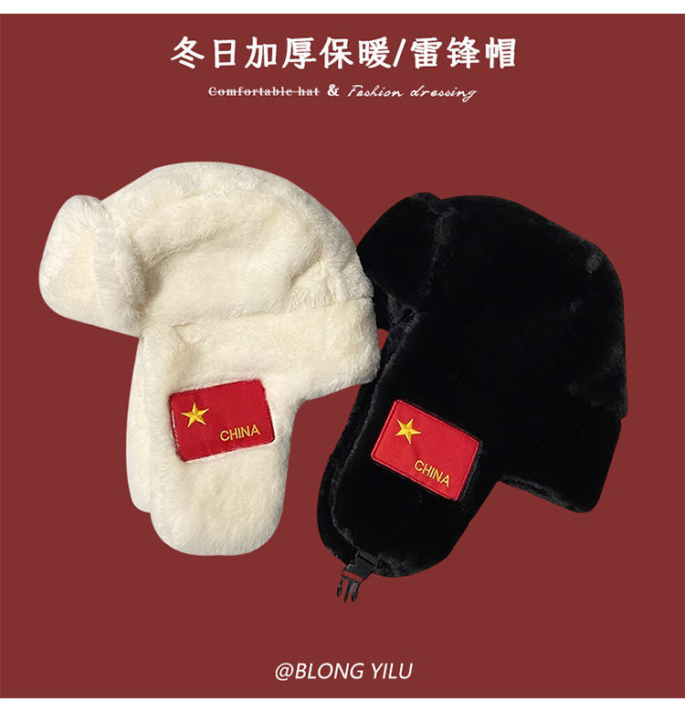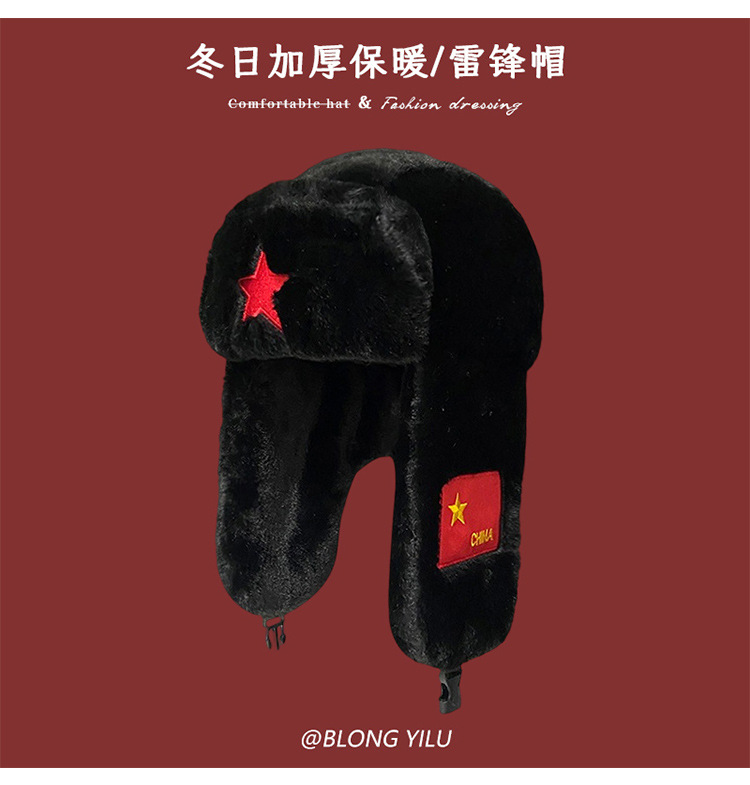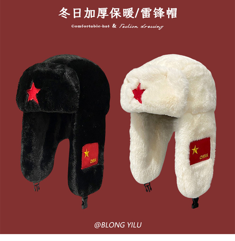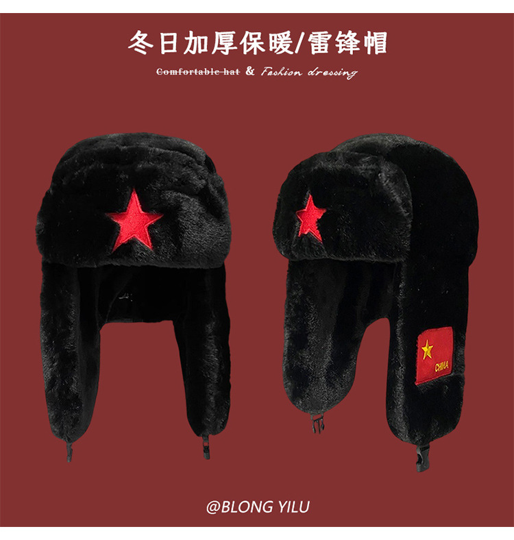 パイル雷鋒帽女性冬保温耳保護綿帽子男性屋外自転車防風防寒紅五角星潮