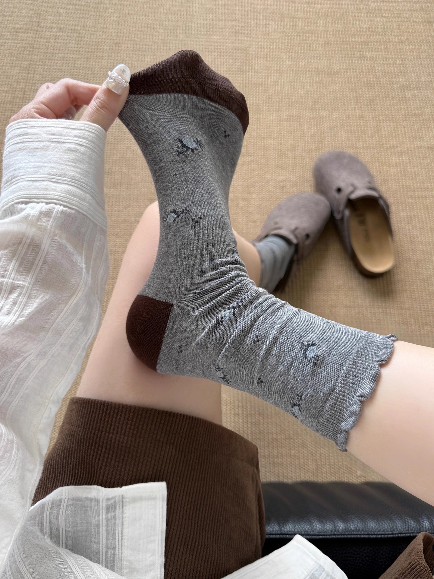 欧货复古波点条纹纽扣袜子女网红美拉德咖色系撞色中筒袜堆堆袜
