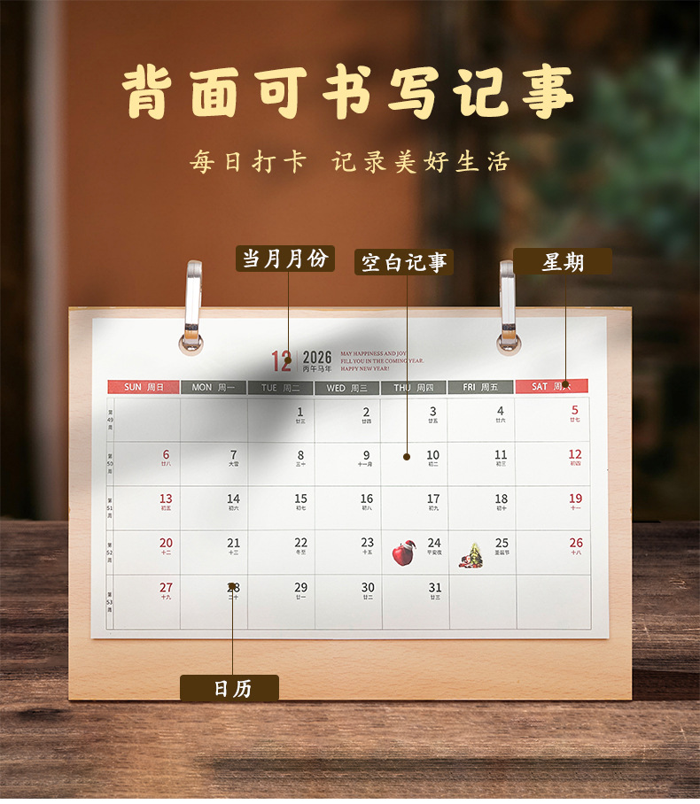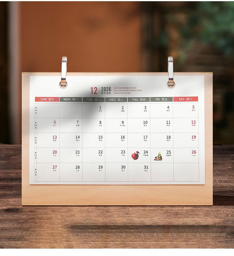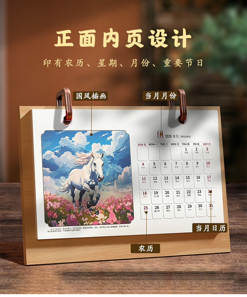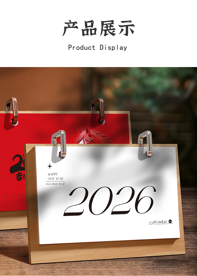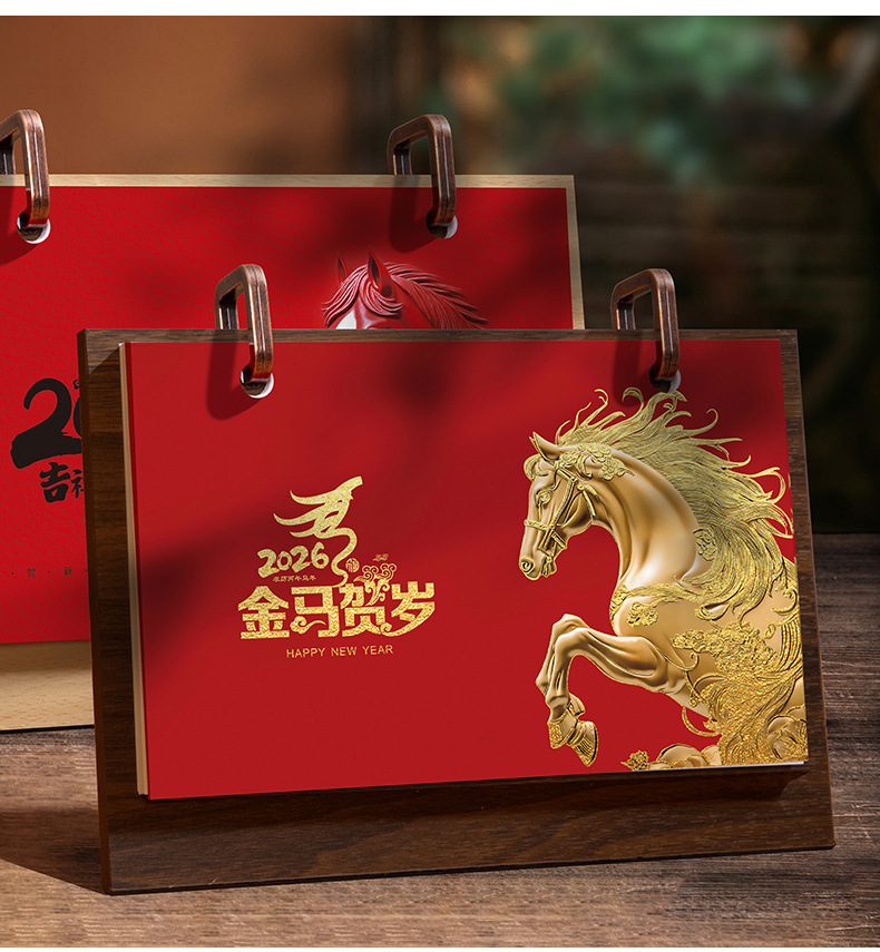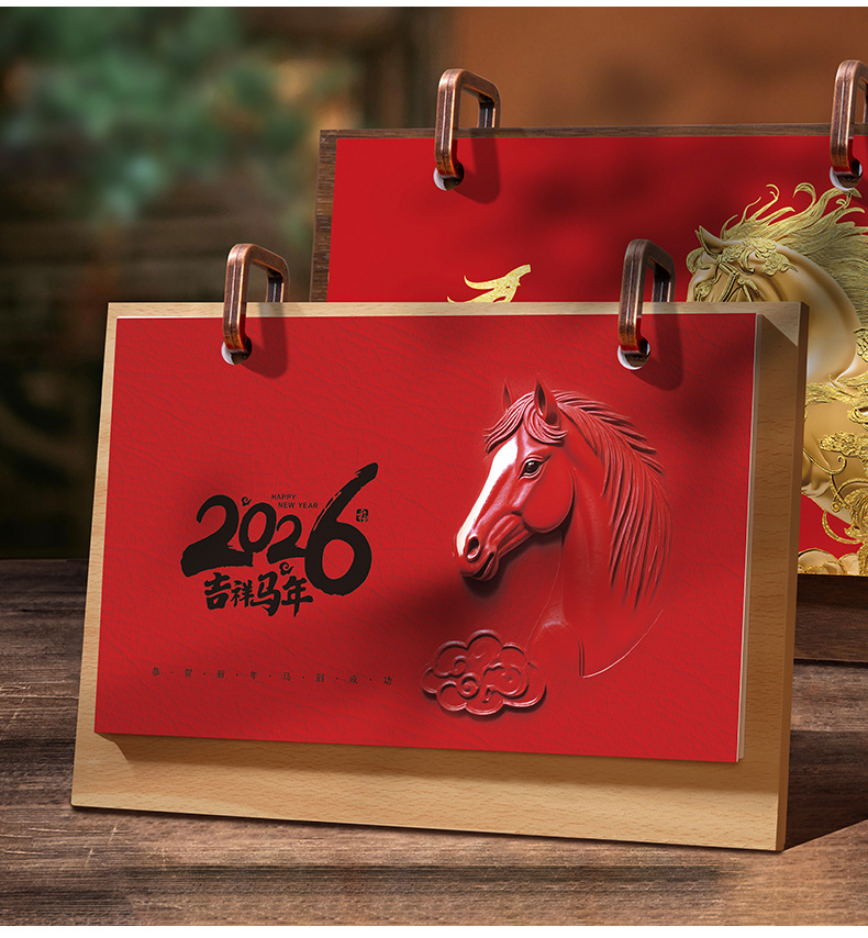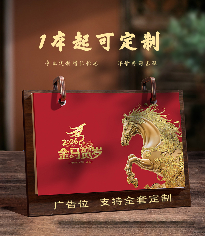 2026年马年木质款台历定制logo办公文化企业订做印刷日历月历摆件