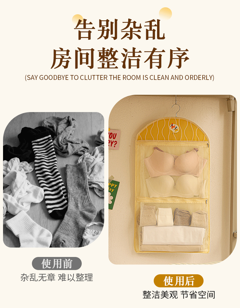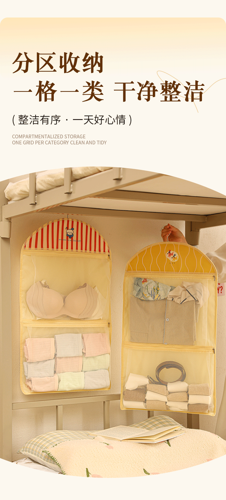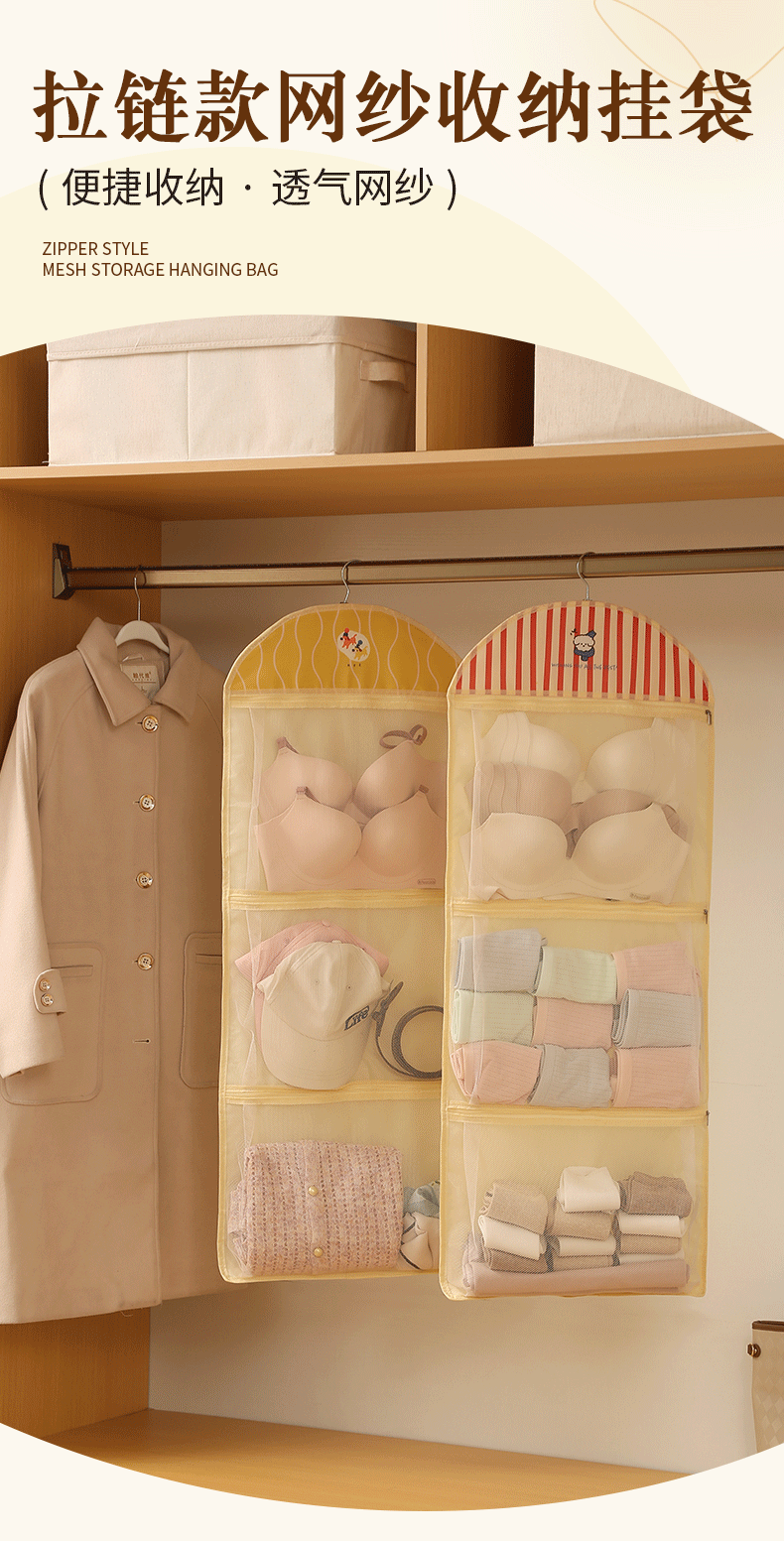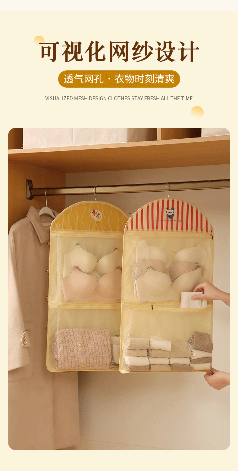 卡通宿舍挂袋多层分区衣柜挂式内衣裤收纳袋网纱透气可视储物挂袋