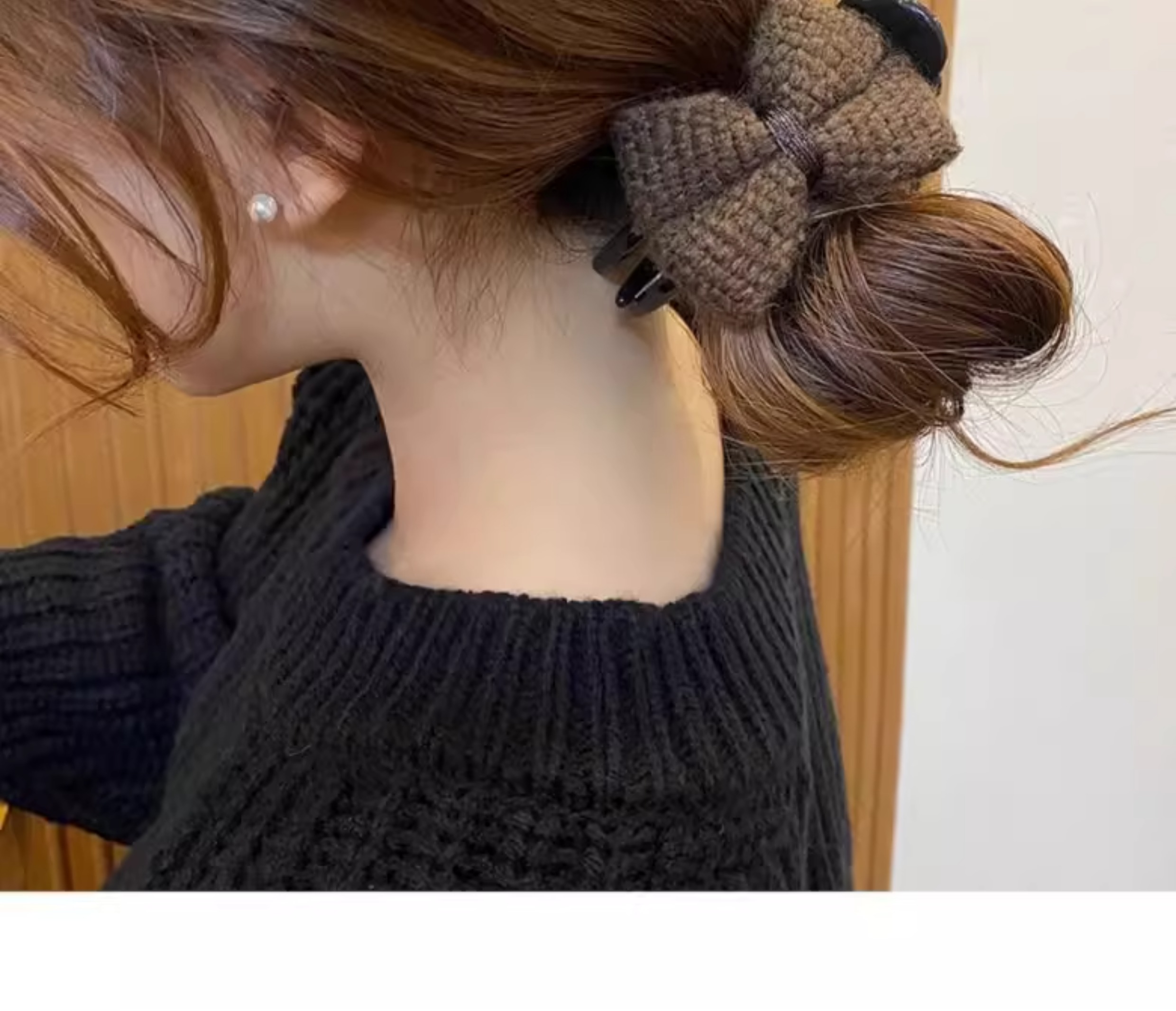 優雅な毛糸の蝶結びの髪飾りの女性の後頭部が可愛いです。