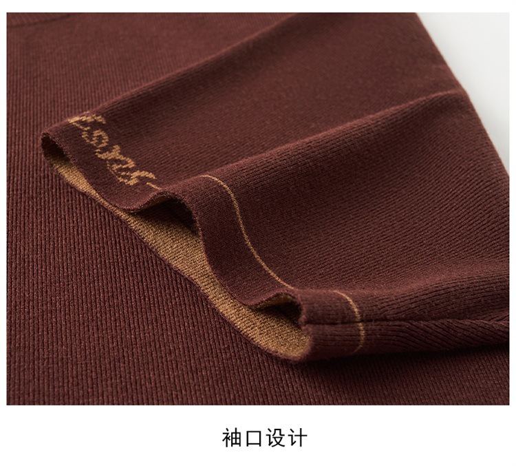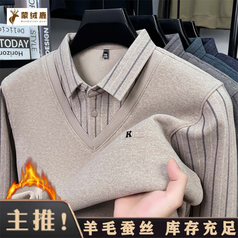 奥粒绒假两件条纹毛衣中年男士休闲加绒加厚保暖上衣含羊毛打底衫