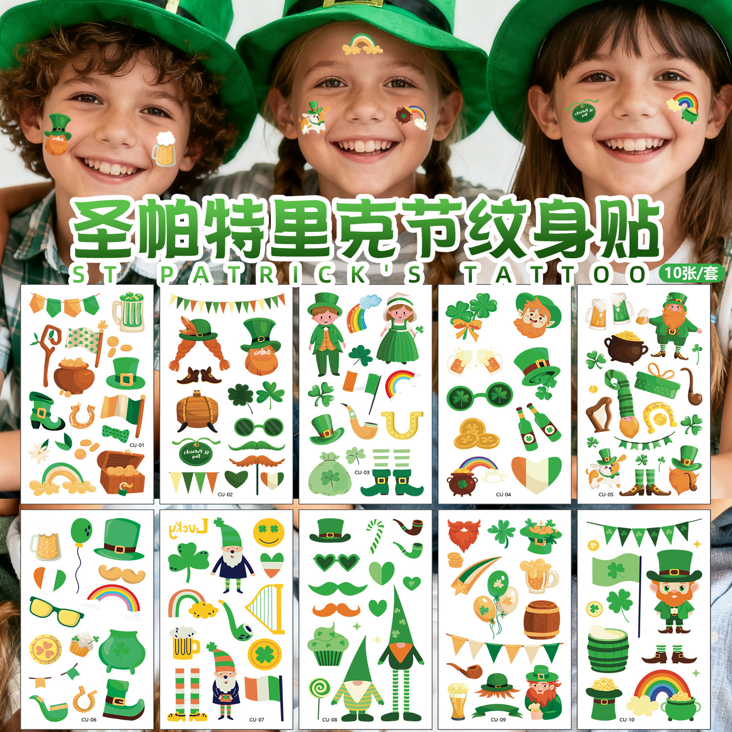 跨境现货新款圣帕特里克节爱尔兰纹身贴儿童脸贴三叶草纹身贴纸