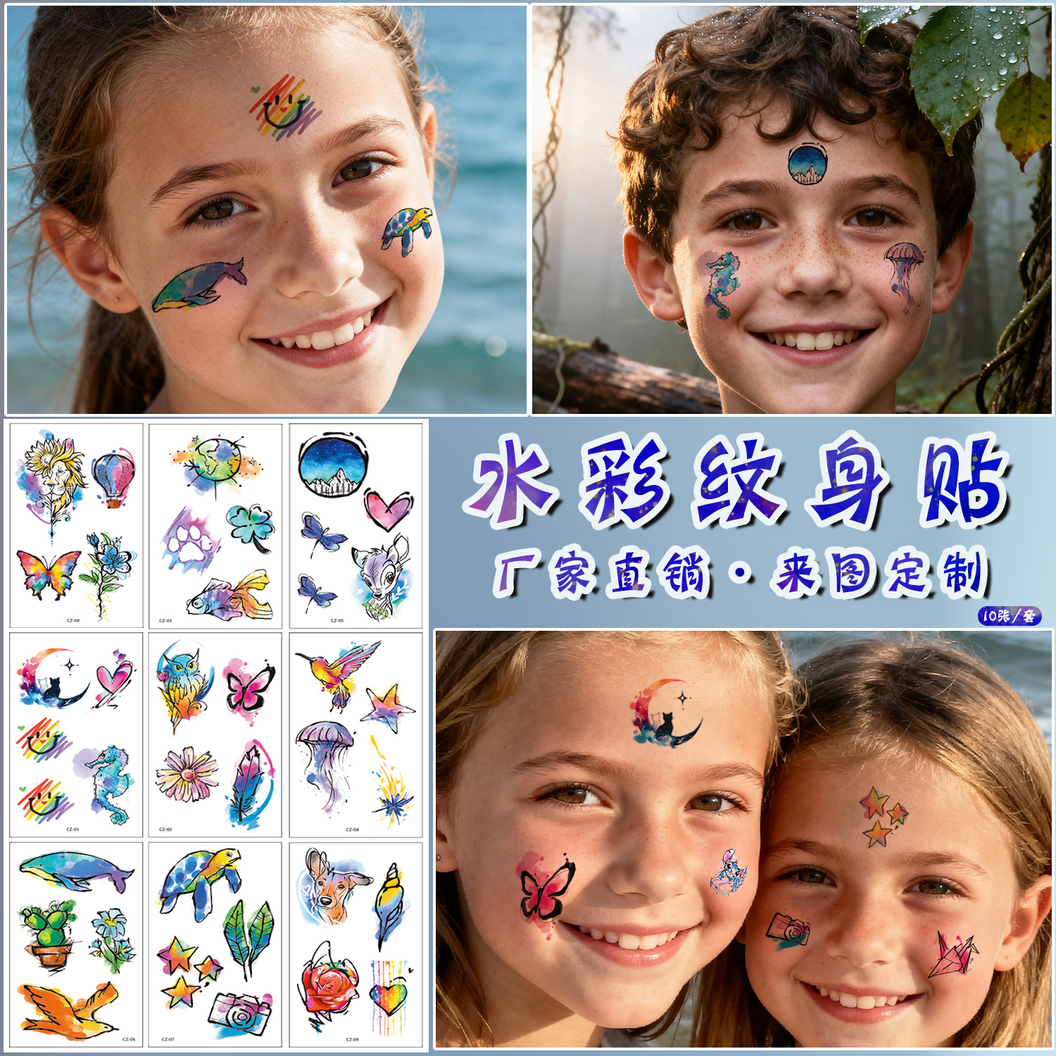 跨境新款彩绘动物可爱纹身贴水彩=贴纸彩色高级感跨境儿童纹身贴