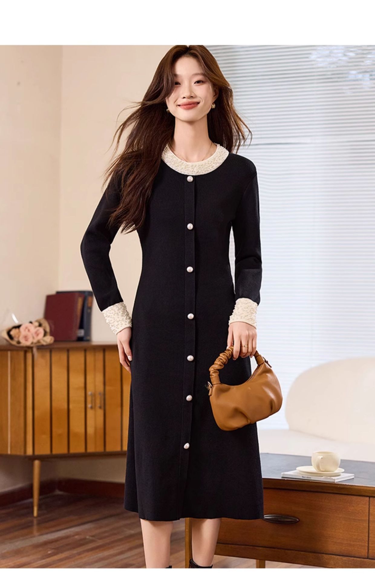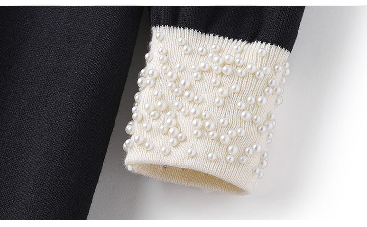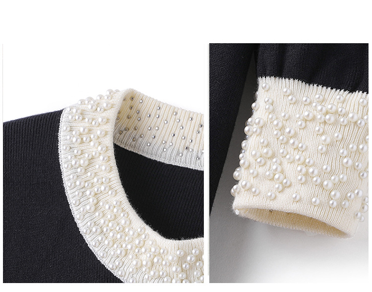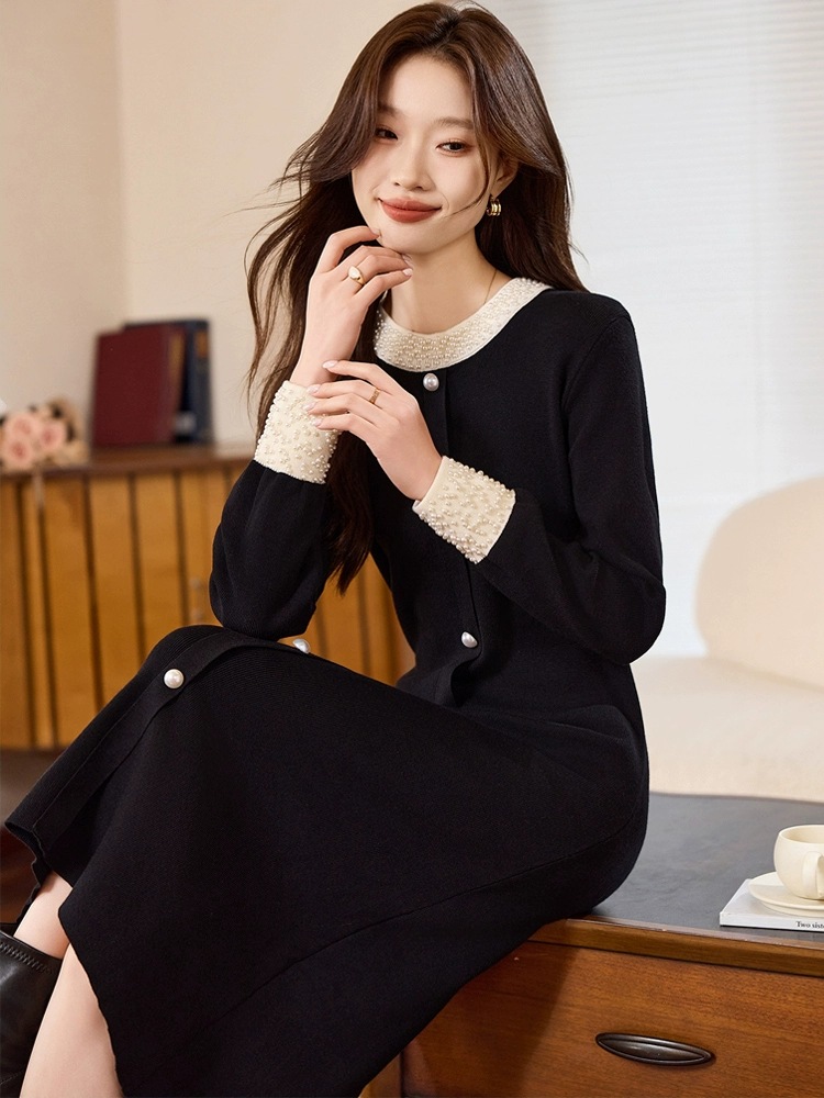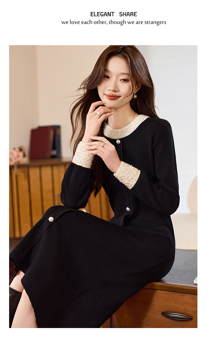 2025新款秋冬季长袖收腰显瘦钉珠黑色连衣裙女小香风感长裙子