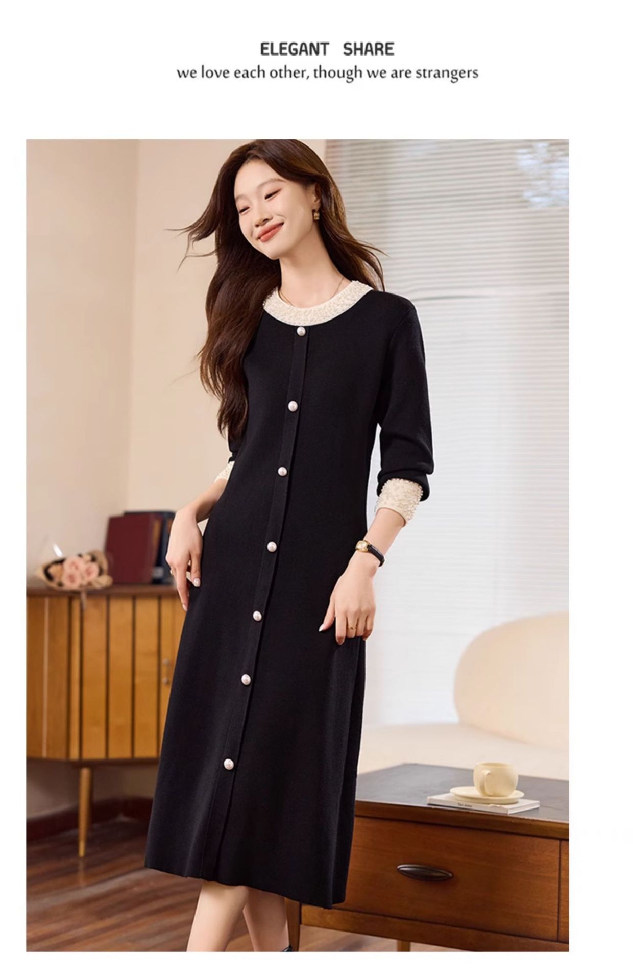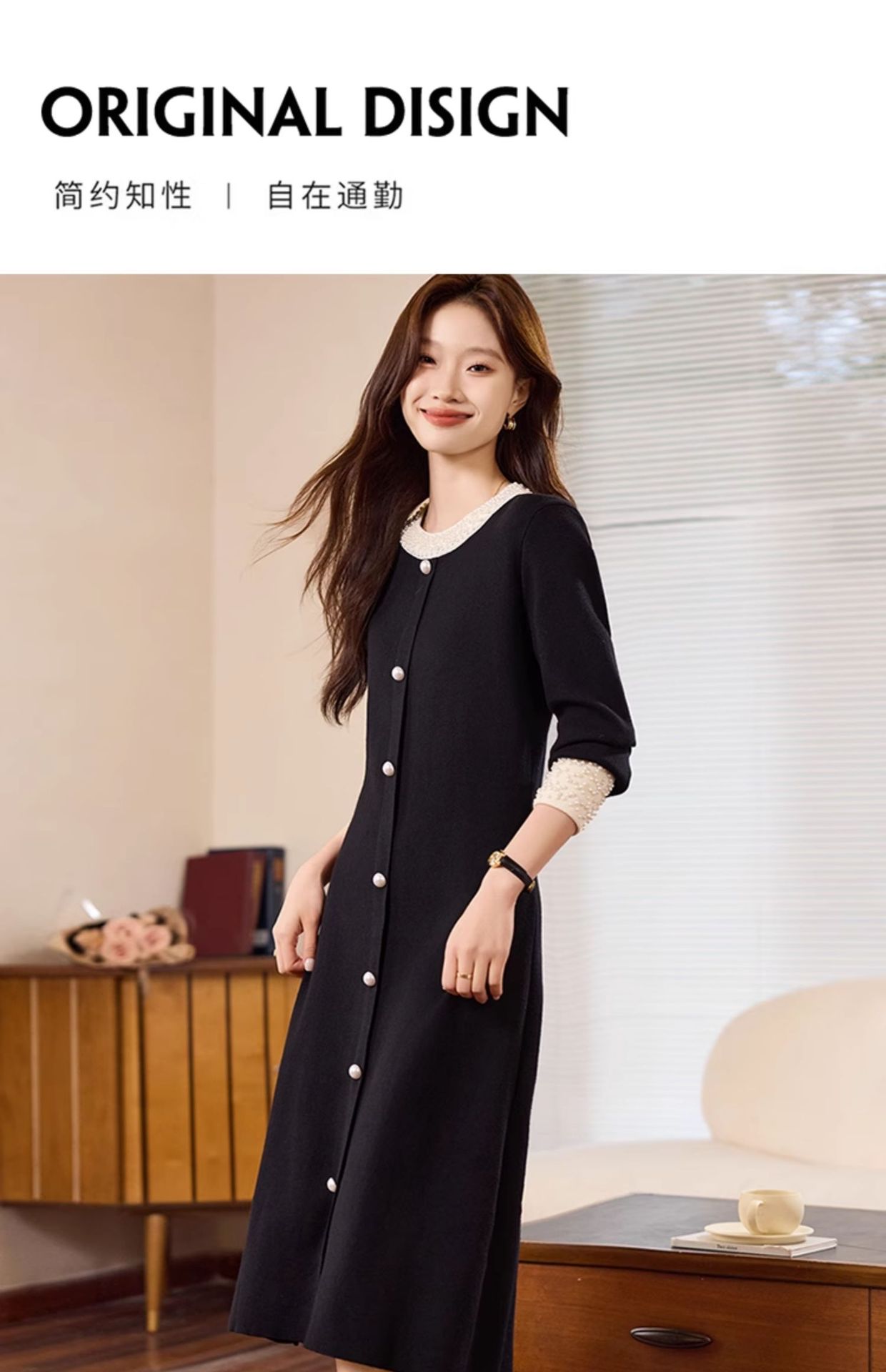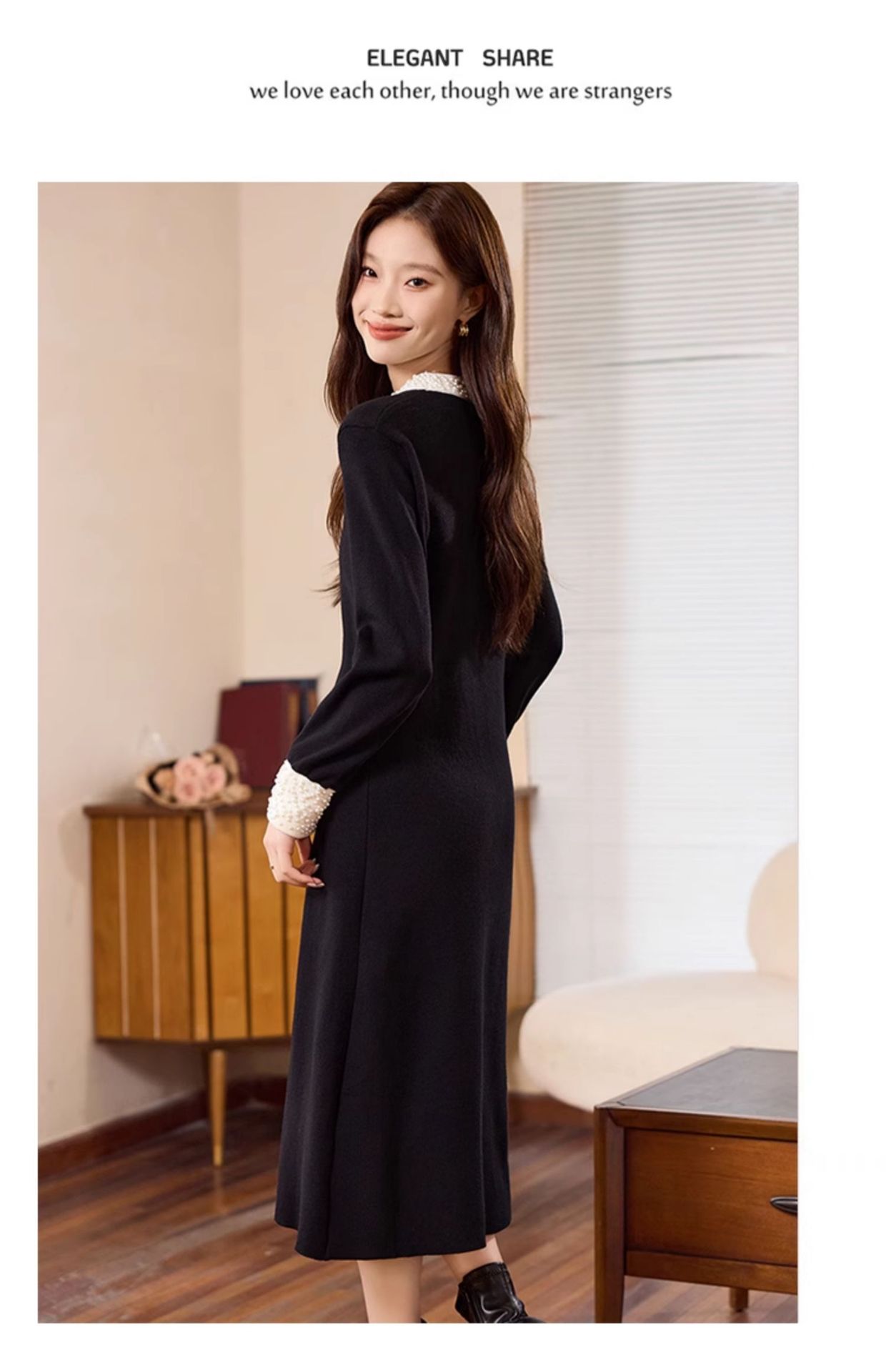 秋のスタイル、フレンチレトロなヘボン風リトルブラックドレス、ウエストを細く見せるニットフィッシュテールドレス、ドールカラー