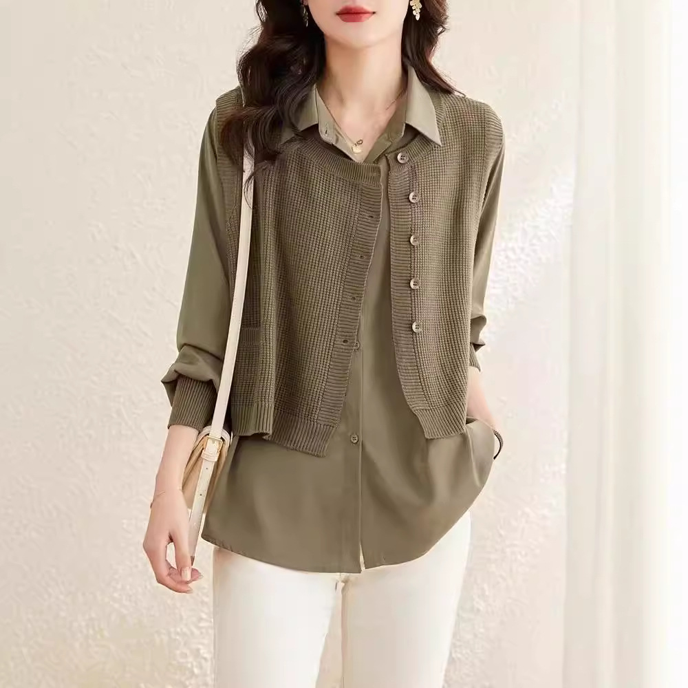 2点セットシャツ レディース 2024秋新作 ゆったりカジュアルシャツジャケット おしゃれニットベスト 長袖トップス