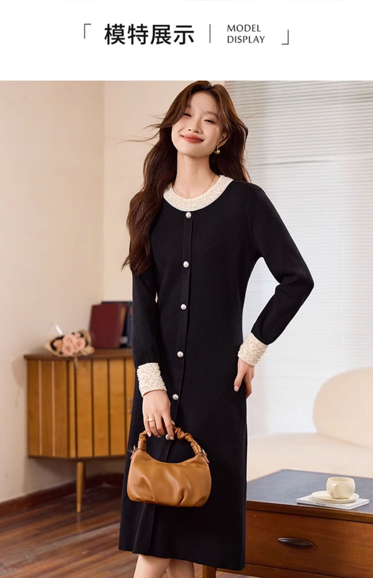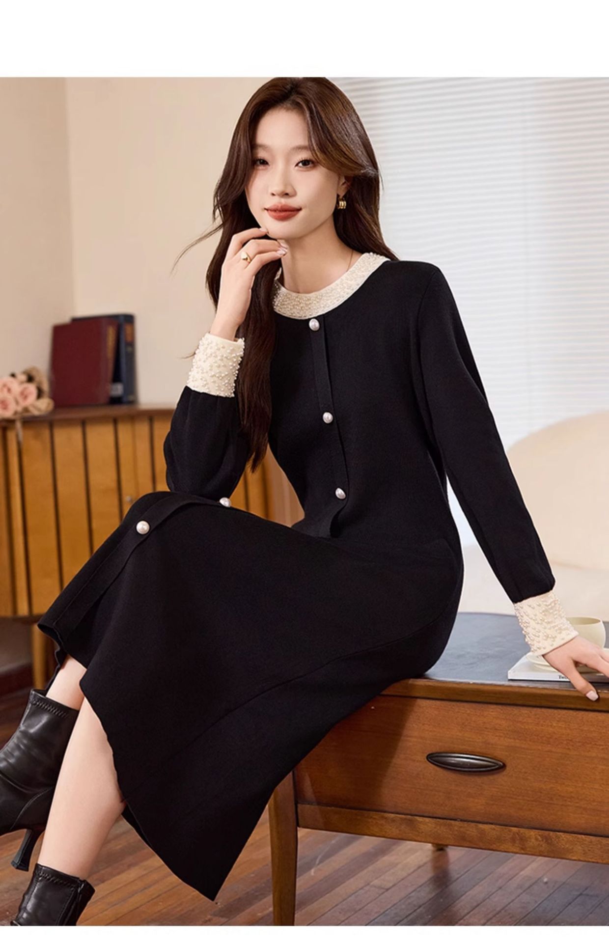 2025年秋冬新款肌理料拼针织秋冬长袖小黑裙显瘦洋毛蓬蓬裙连衣裙